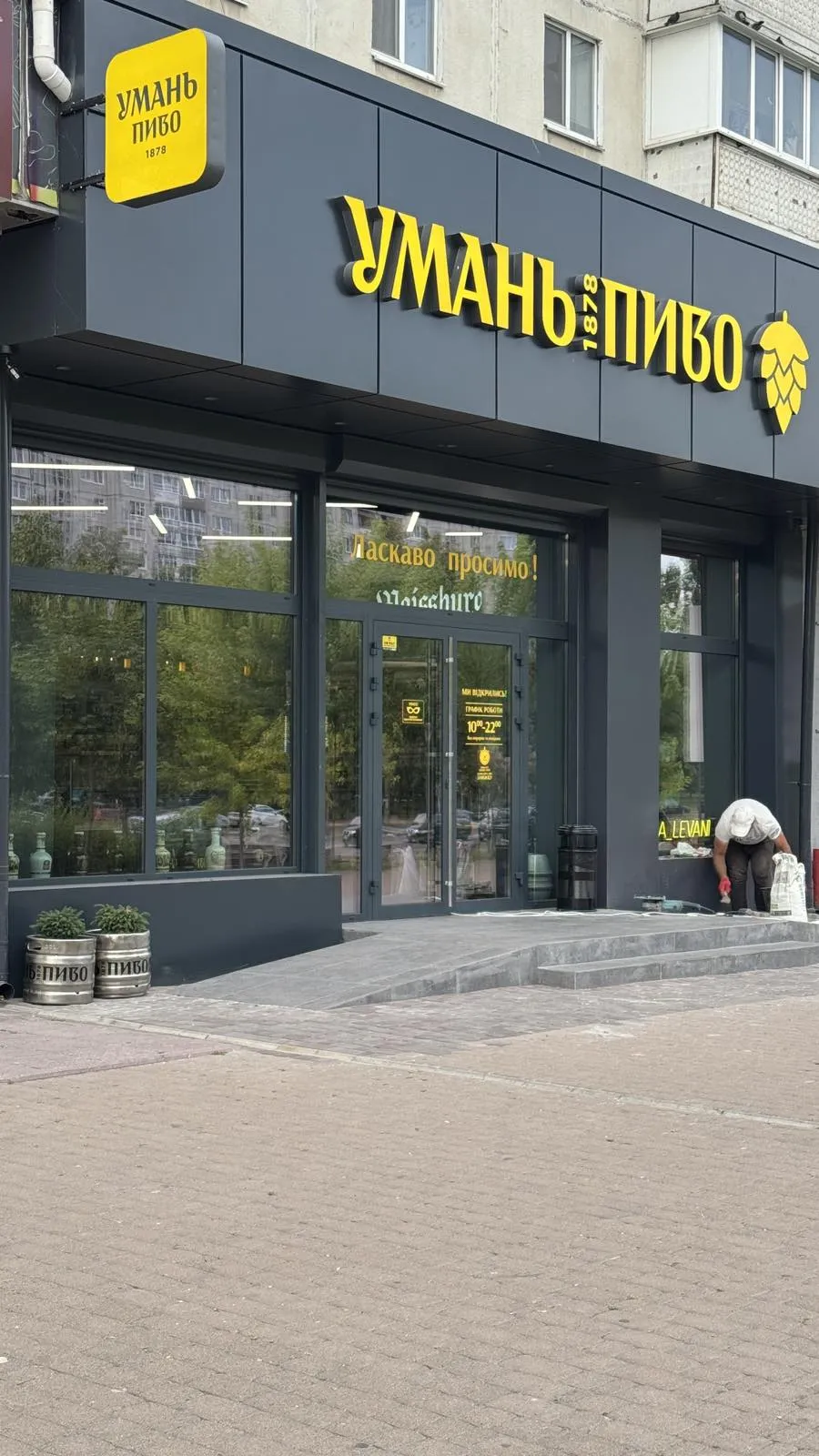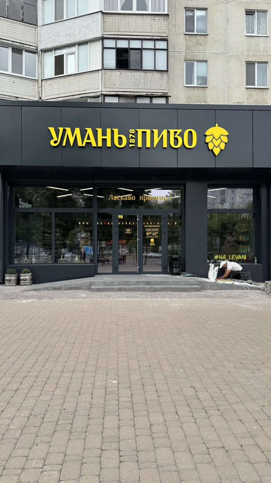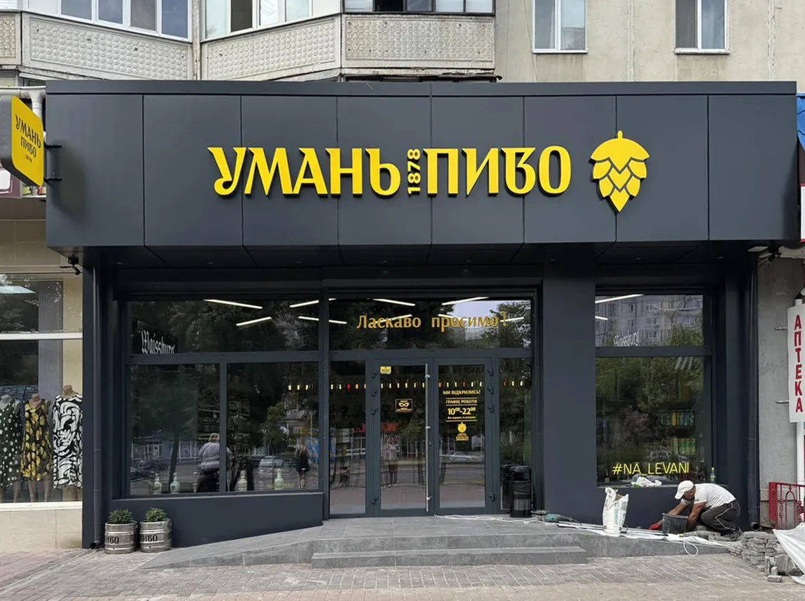 Оформлення фасаду магазину "Уманьпиво" виконано в їхньому фірмовому стилі.