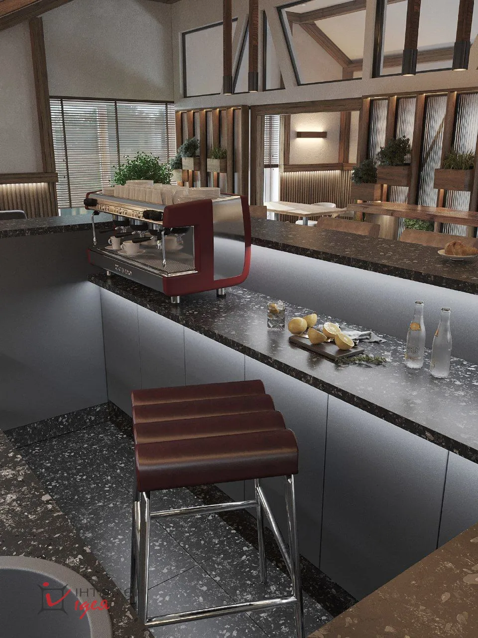 - Вінілова підлога "SPC The Floor Stone P3002 Velluto" (800x400х6мм) та вінілова підлога "Vitality" (в зоні бару),