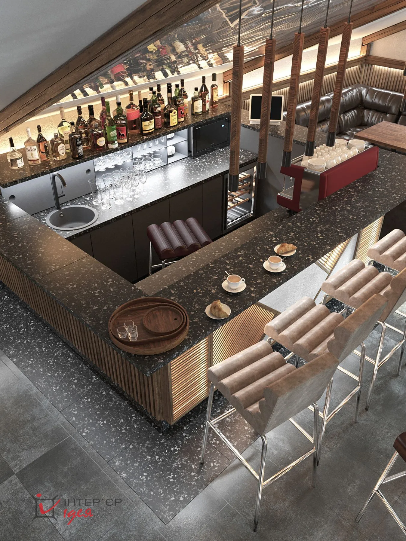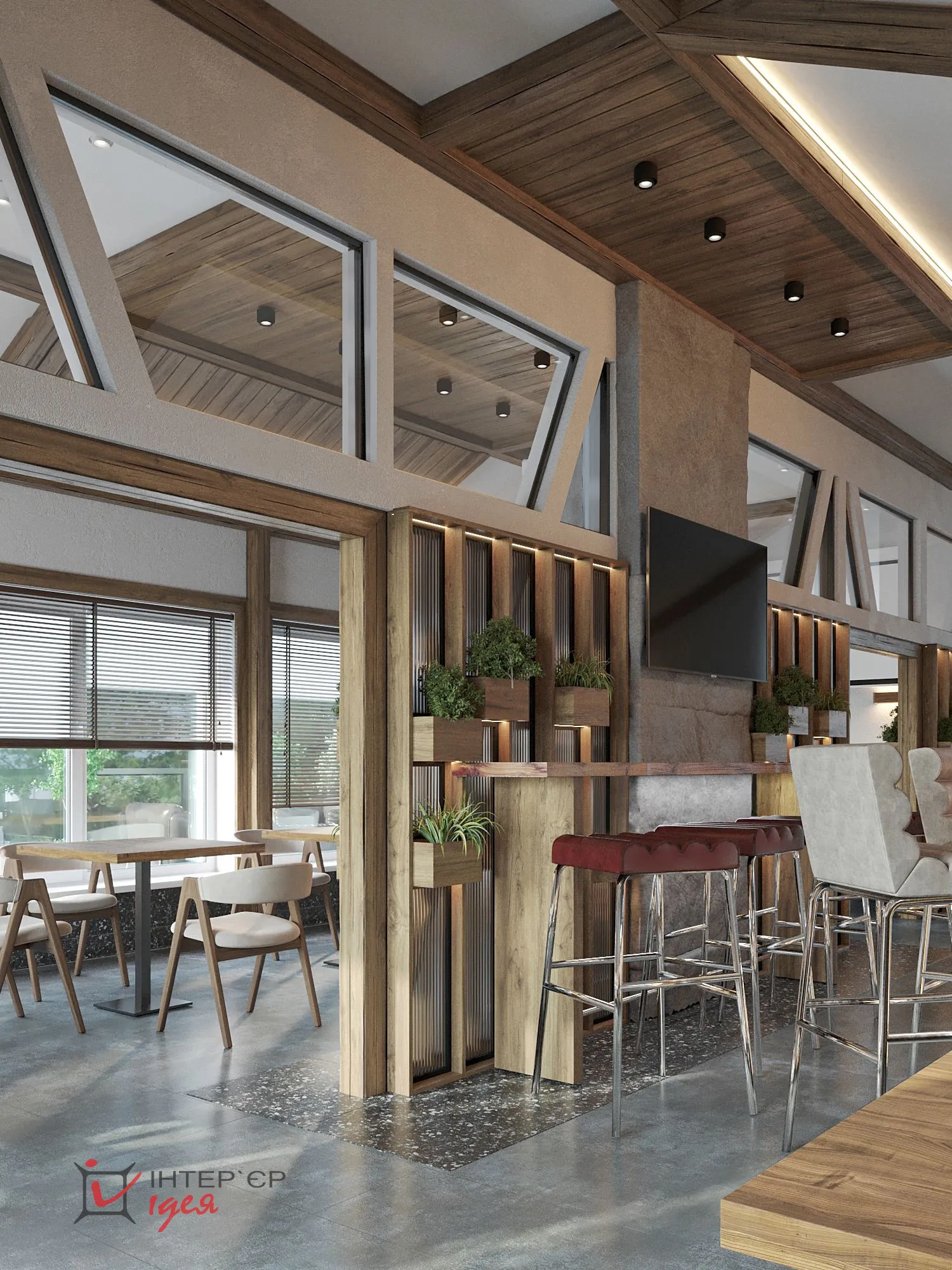 - Стеля: гіпсокартон та дерев'яна вагонка фальш-балки від "West-wood" (110х110мм). Над баром - скло,