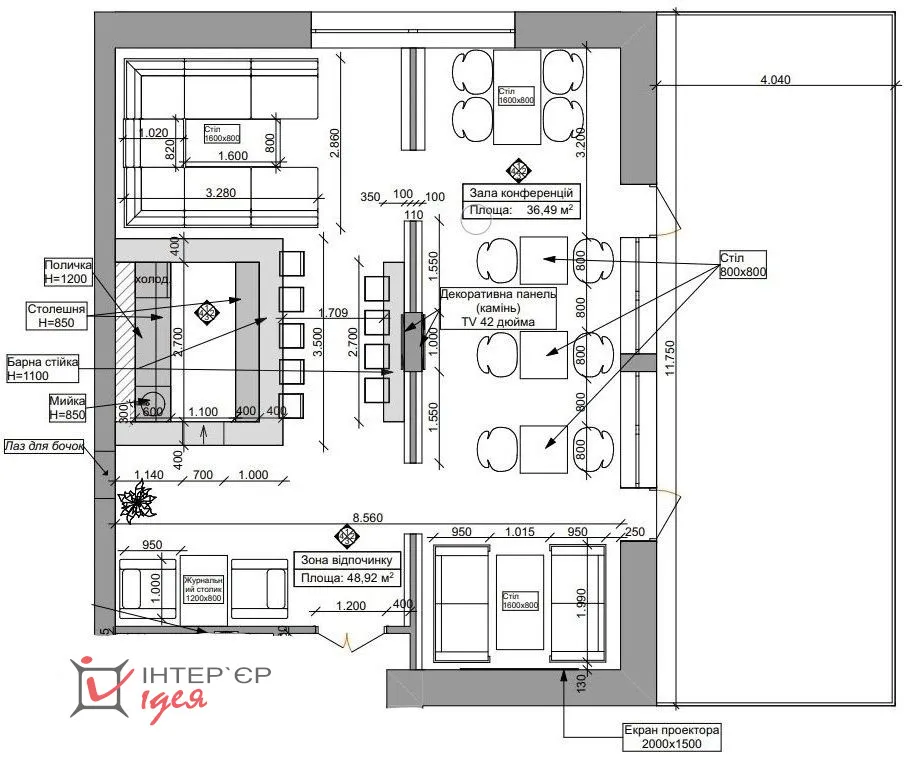 На одній зі стін передбачено екран для демонстрації з проєктора, а на центральній колонні - 2 телевізора.