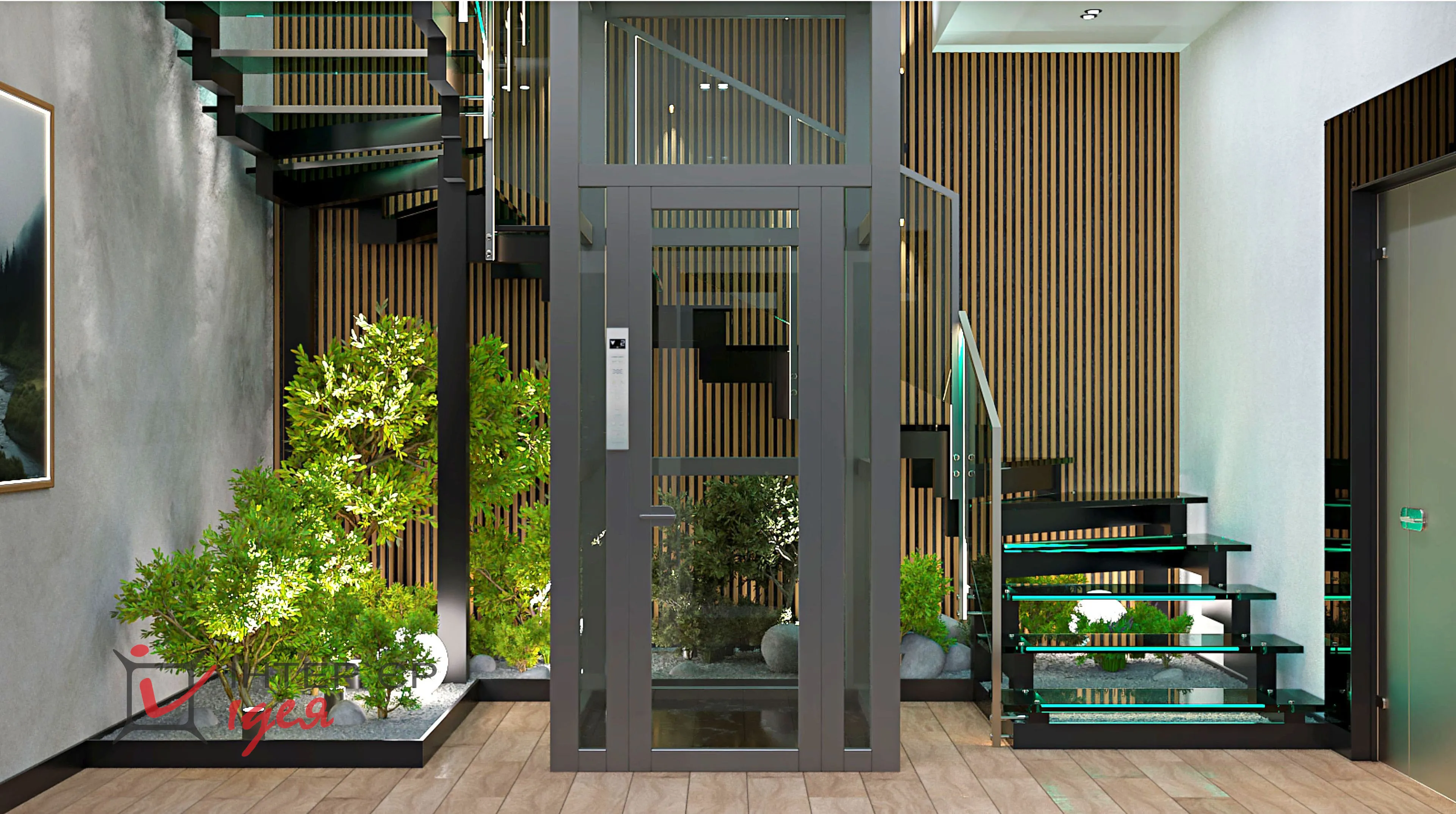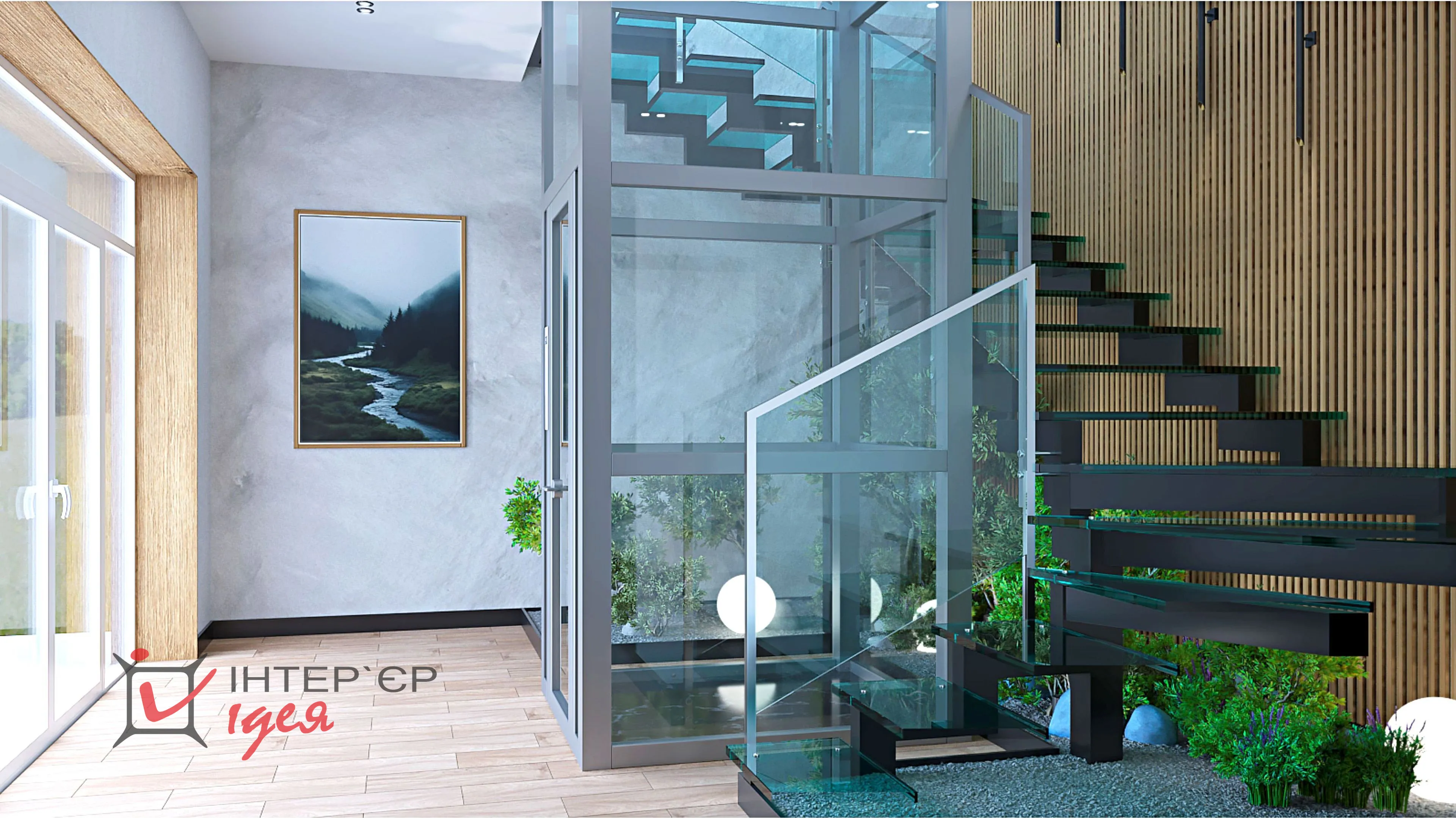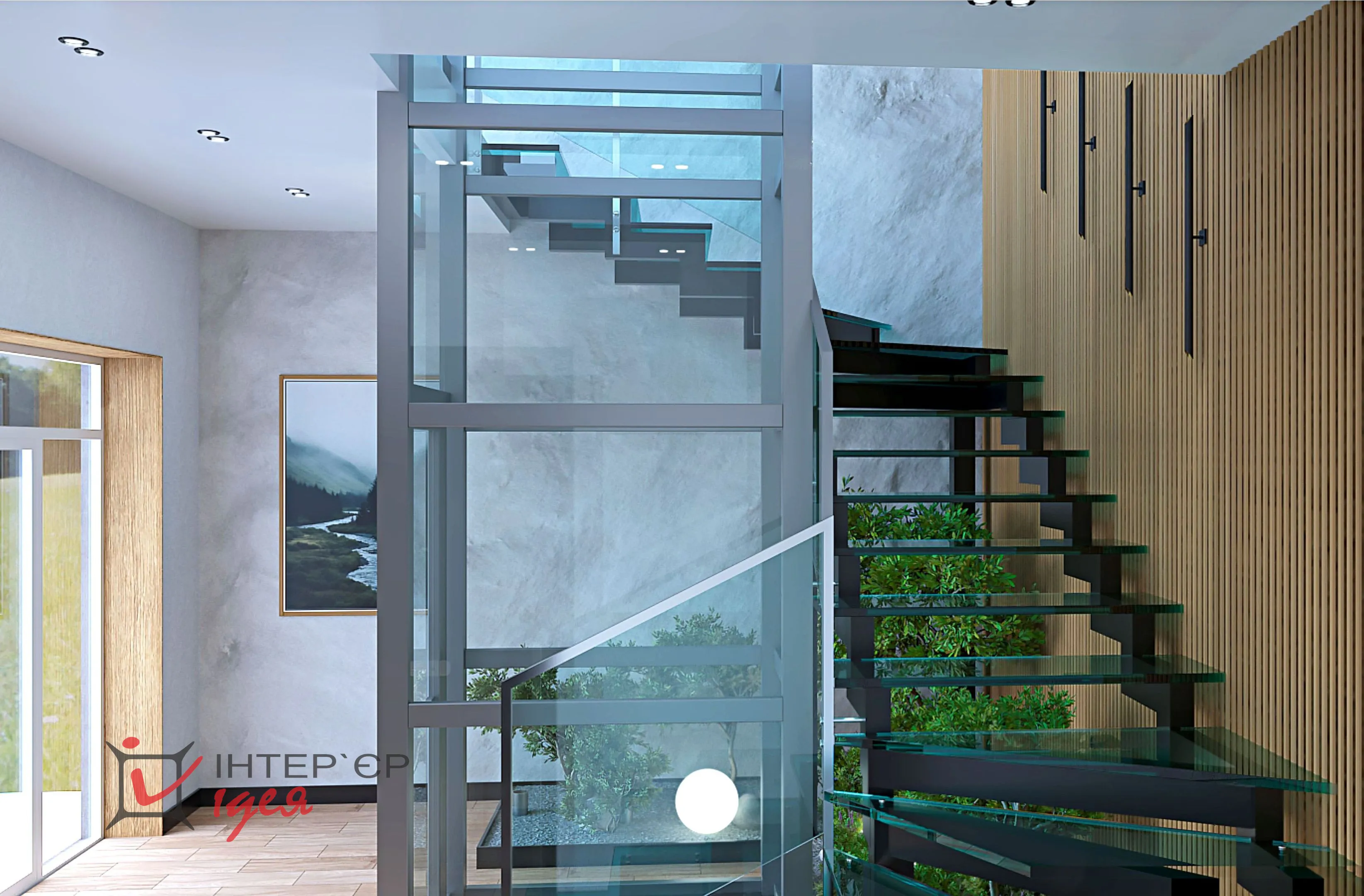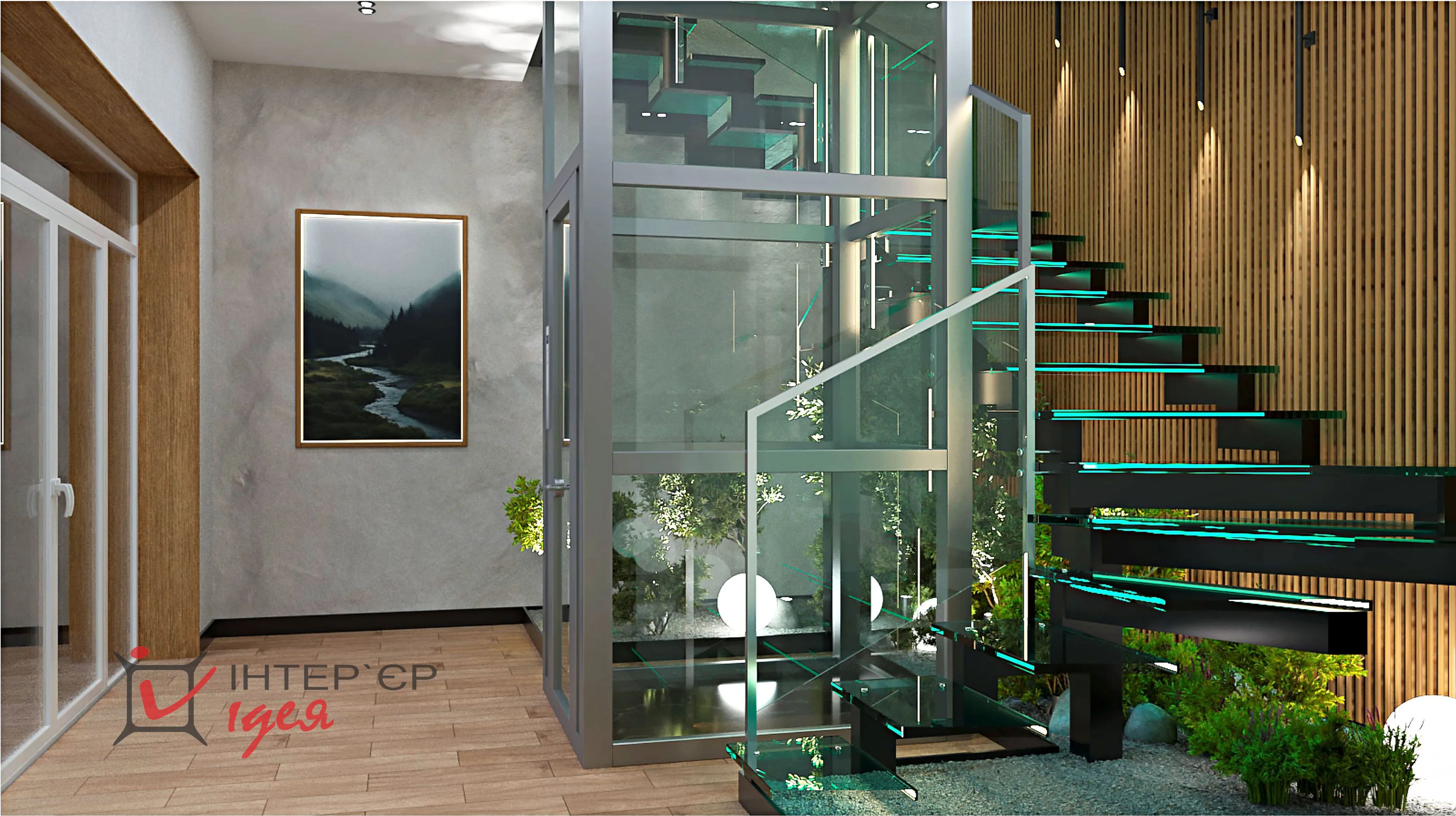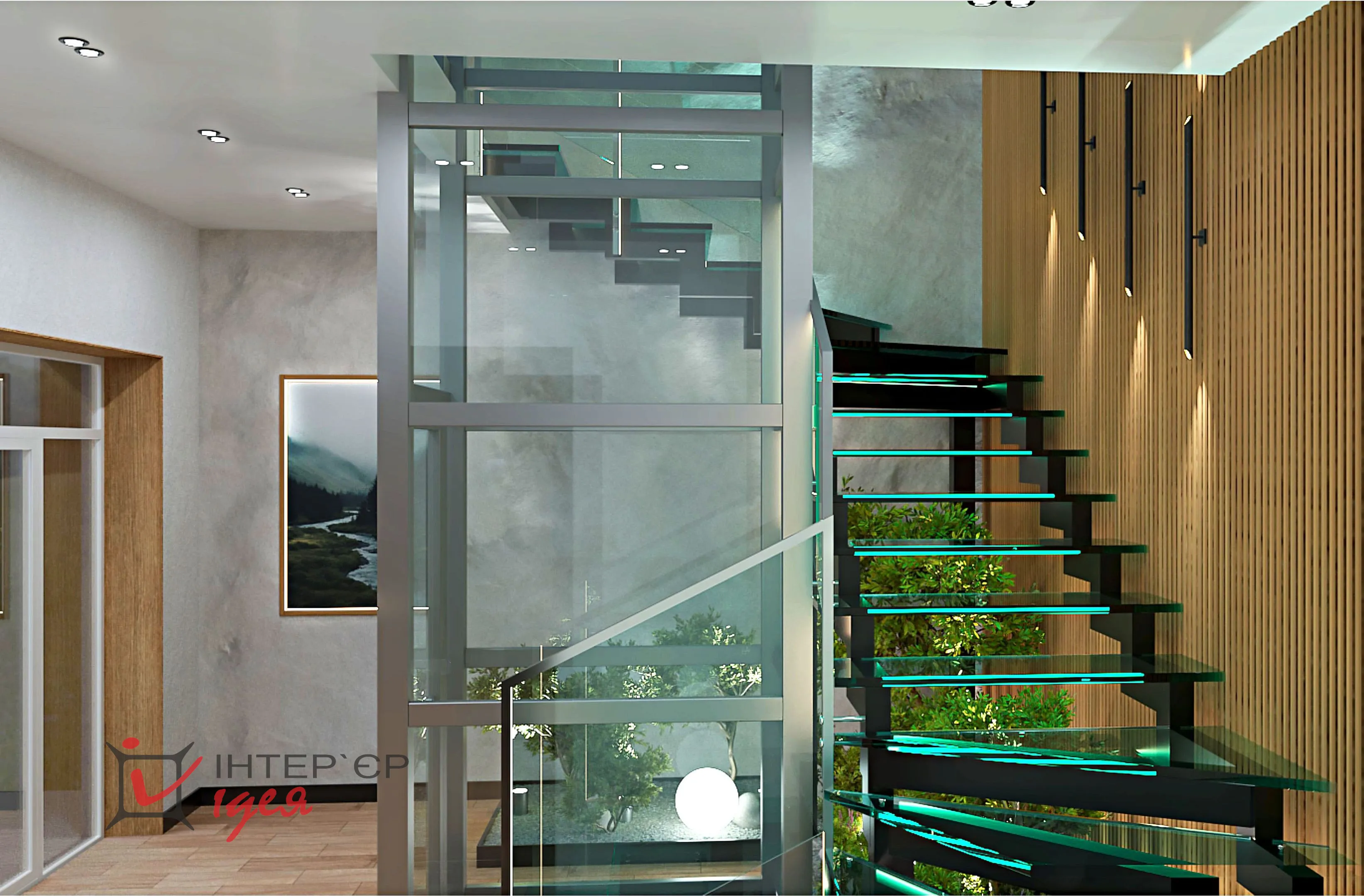 Щоб додати атмосферності та природного затишку, зону під сходами оформлено декоративним камінням, зеленими насадженнями та світильниками-кулями.