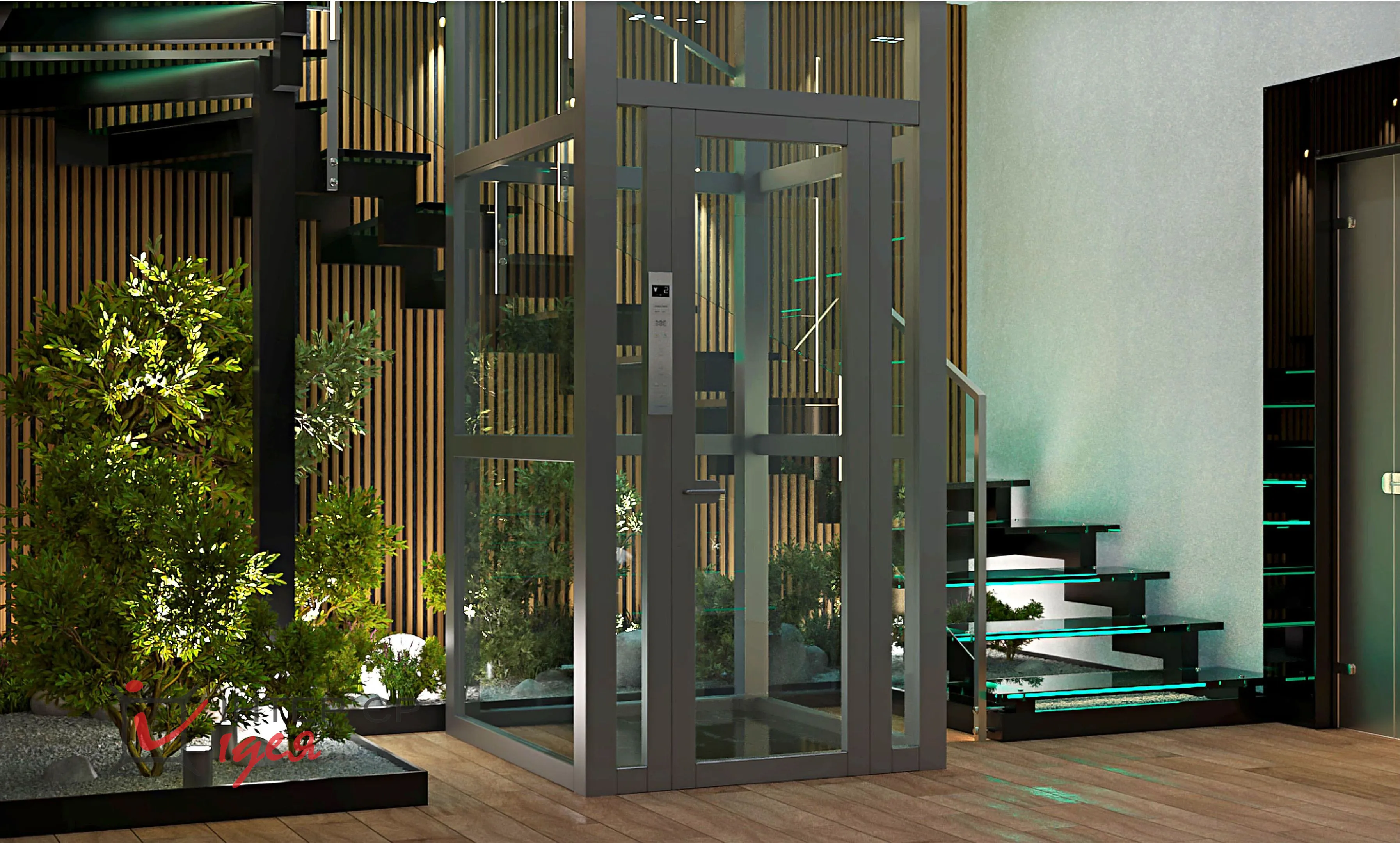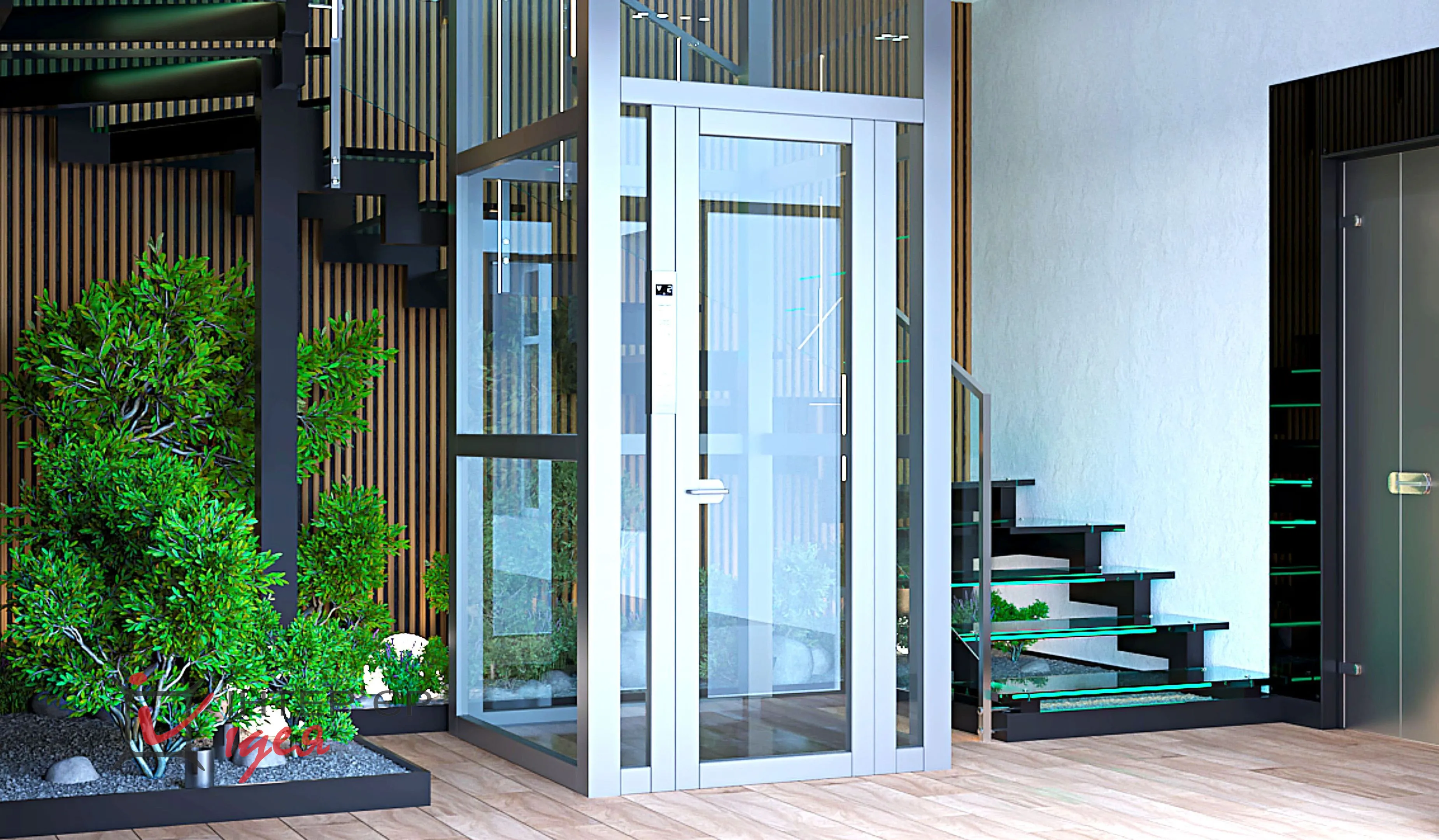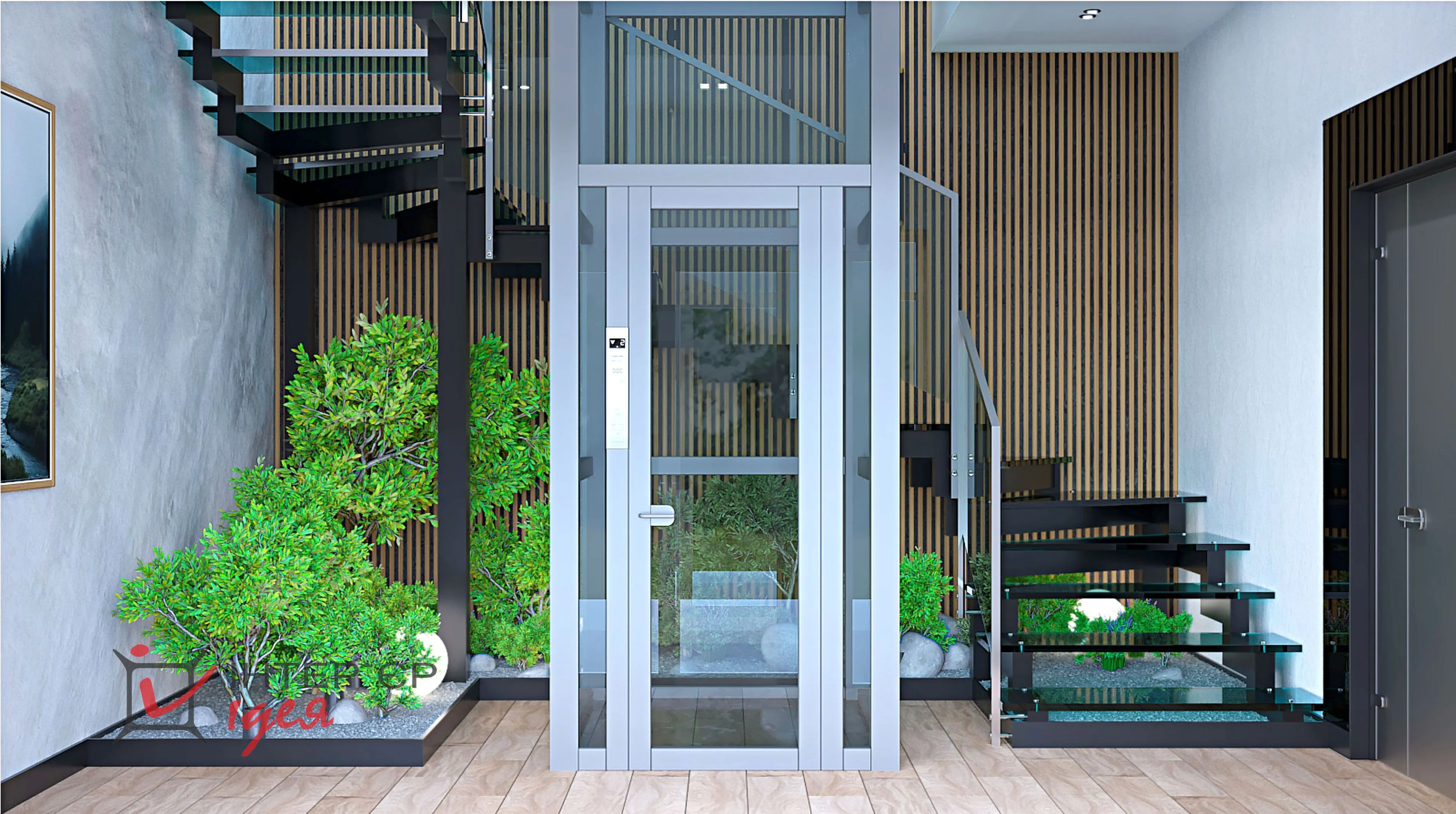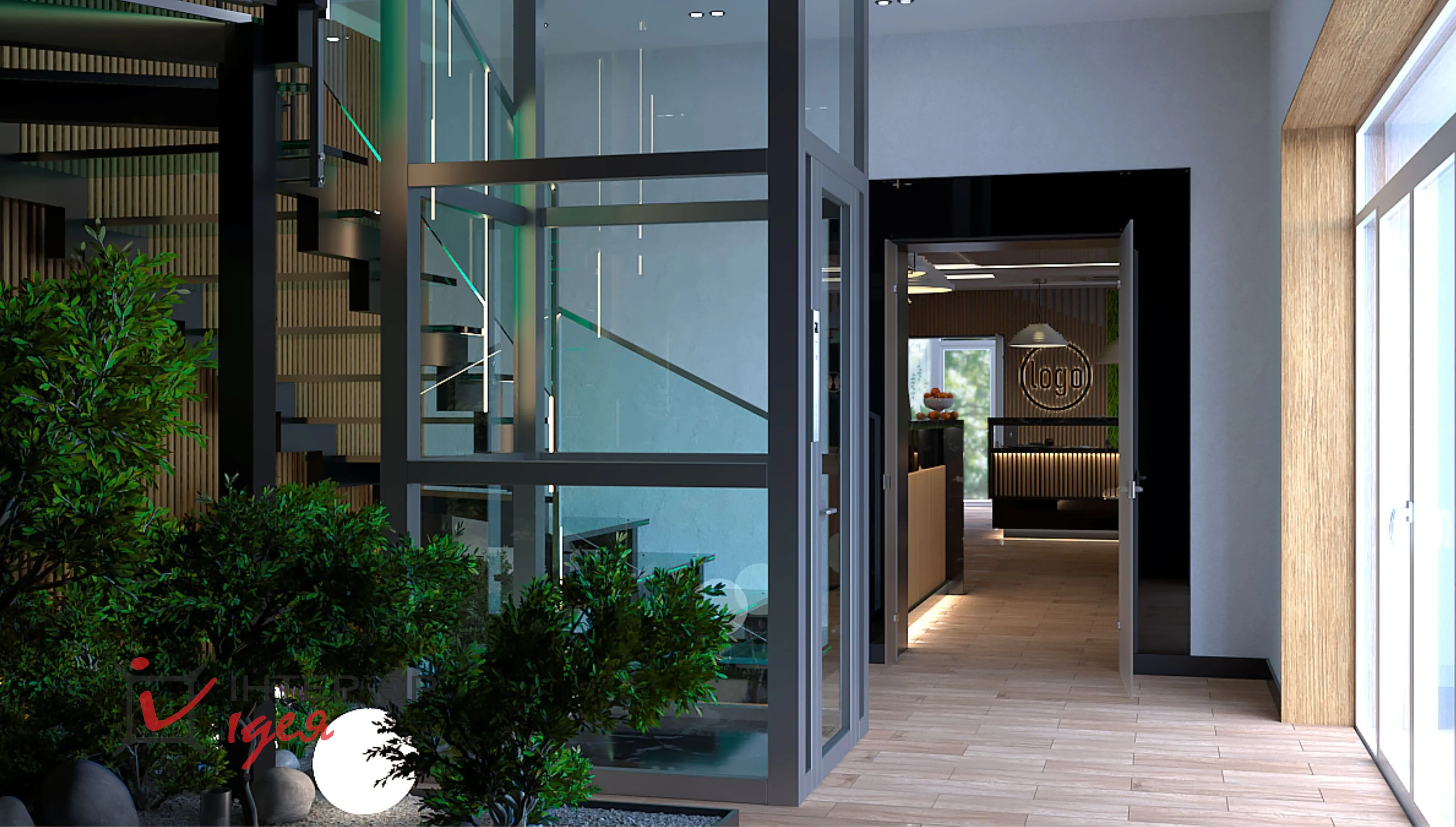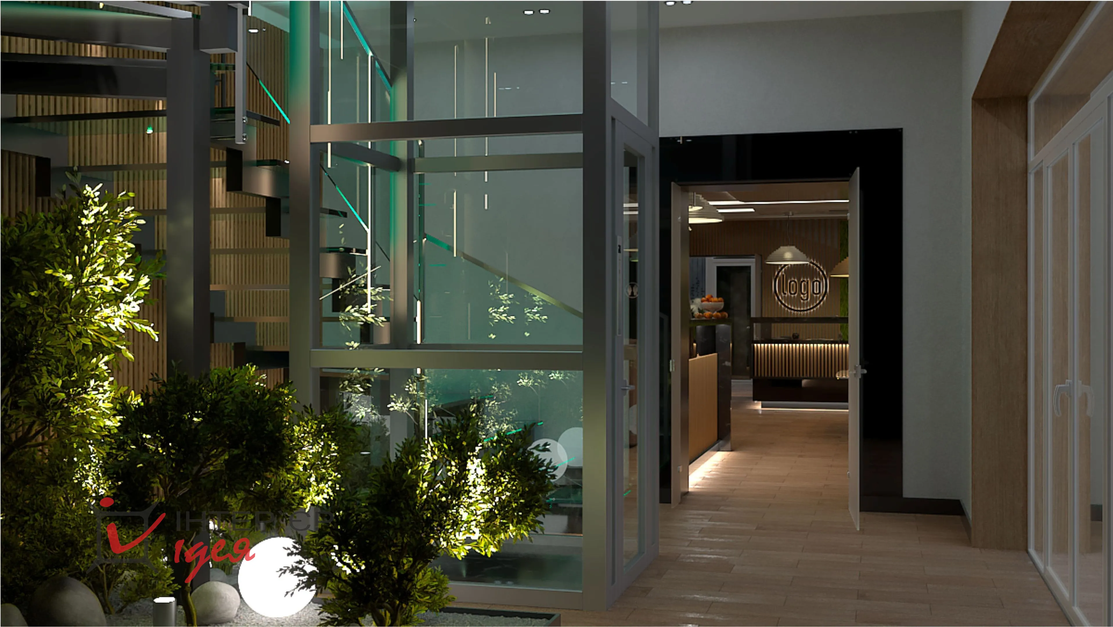 Щоб додати атмосферності та природного затишку, зону під сходами оформлено декоративним камінням, зеленими насадженнями та світильниками-кулями.