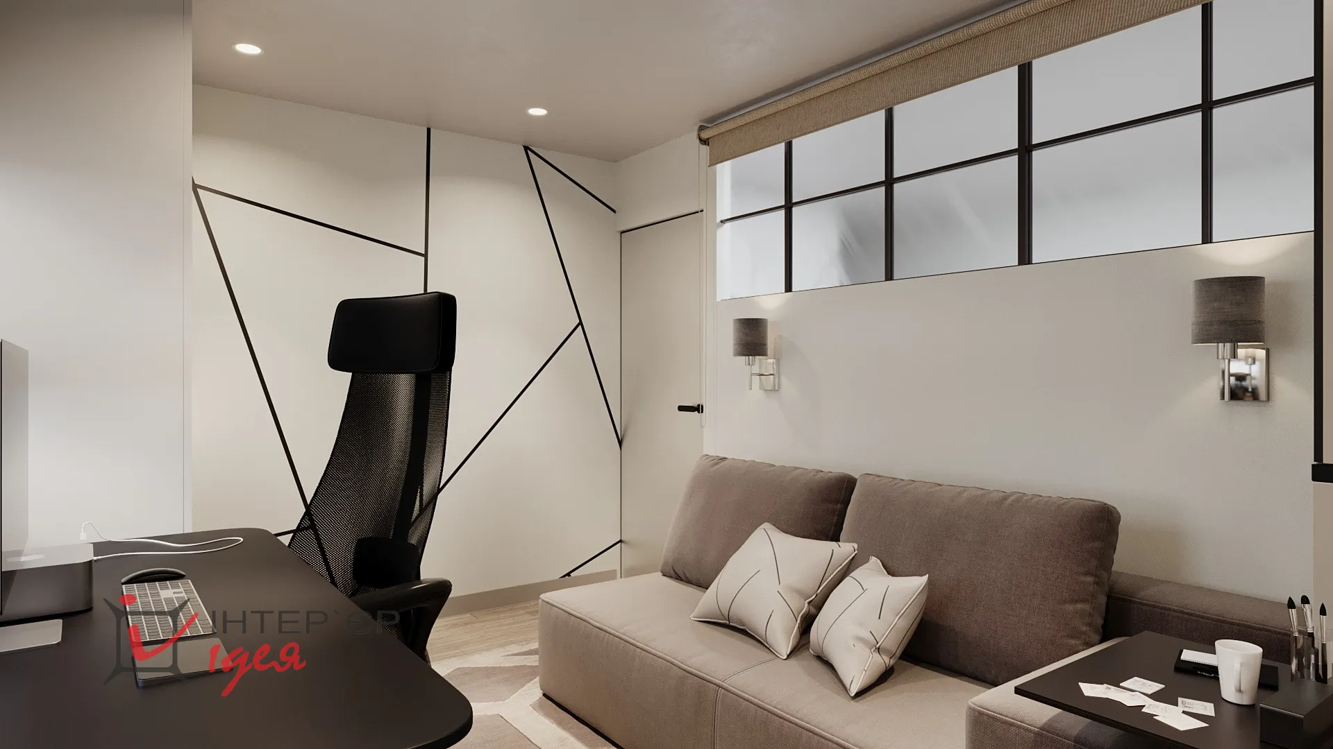 Інтер’єр оформлений у стилі сучасного мінімалізму з нотками скандинавської простоти й легким відтінком індустріального стилю, який підкреслює скляна перегородка з чорною металевою рамою.