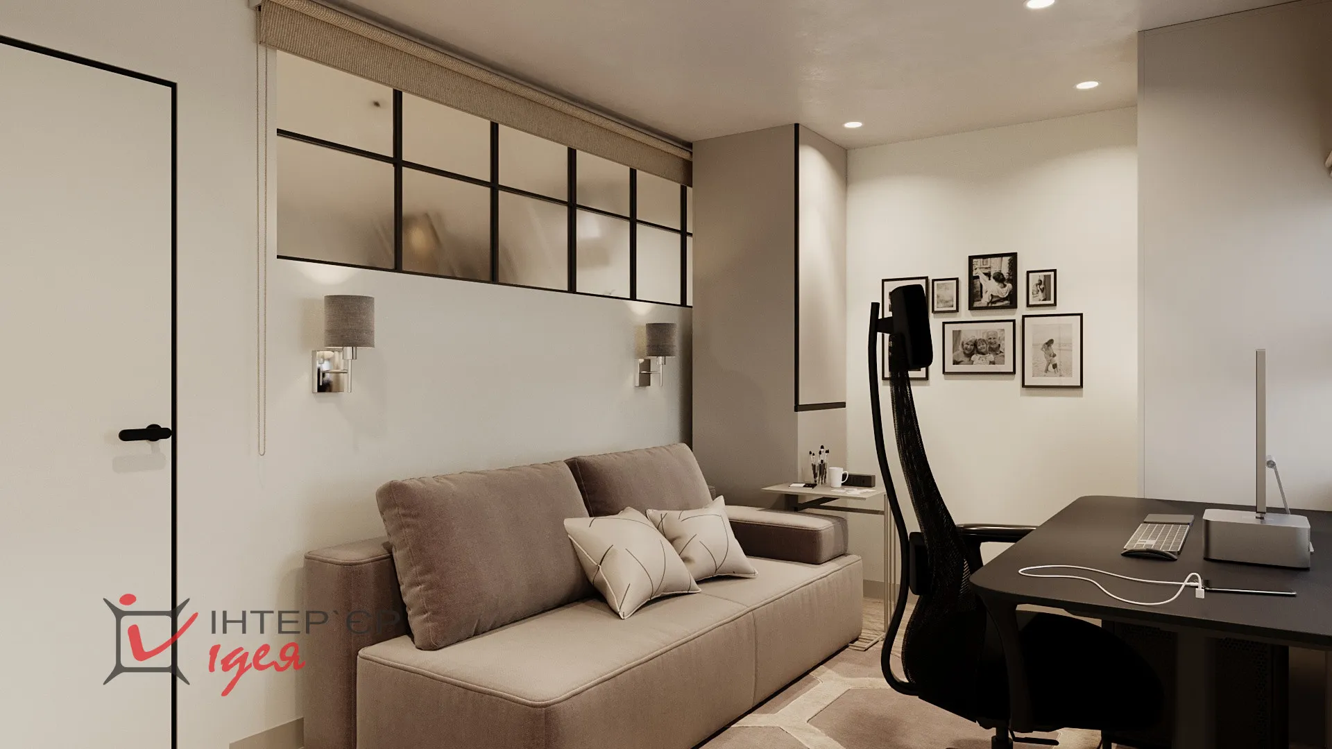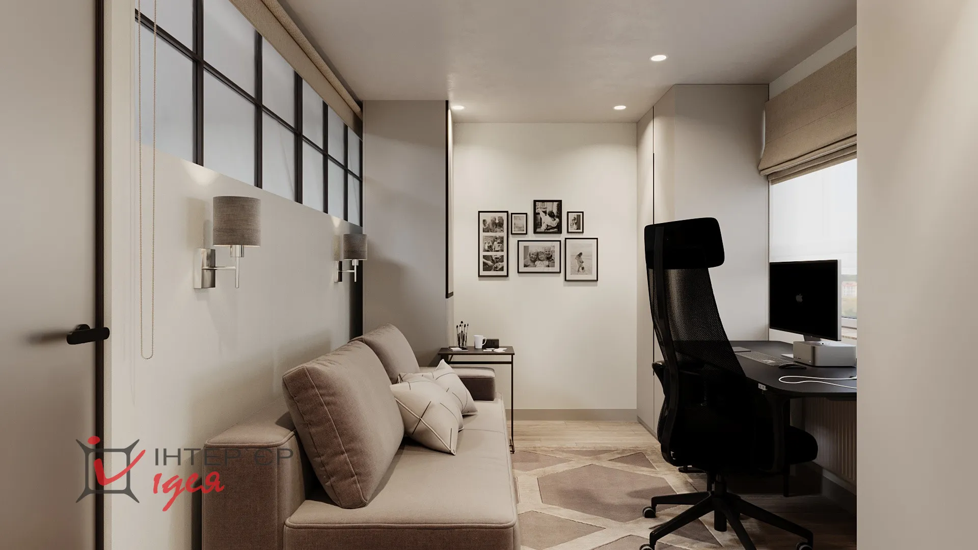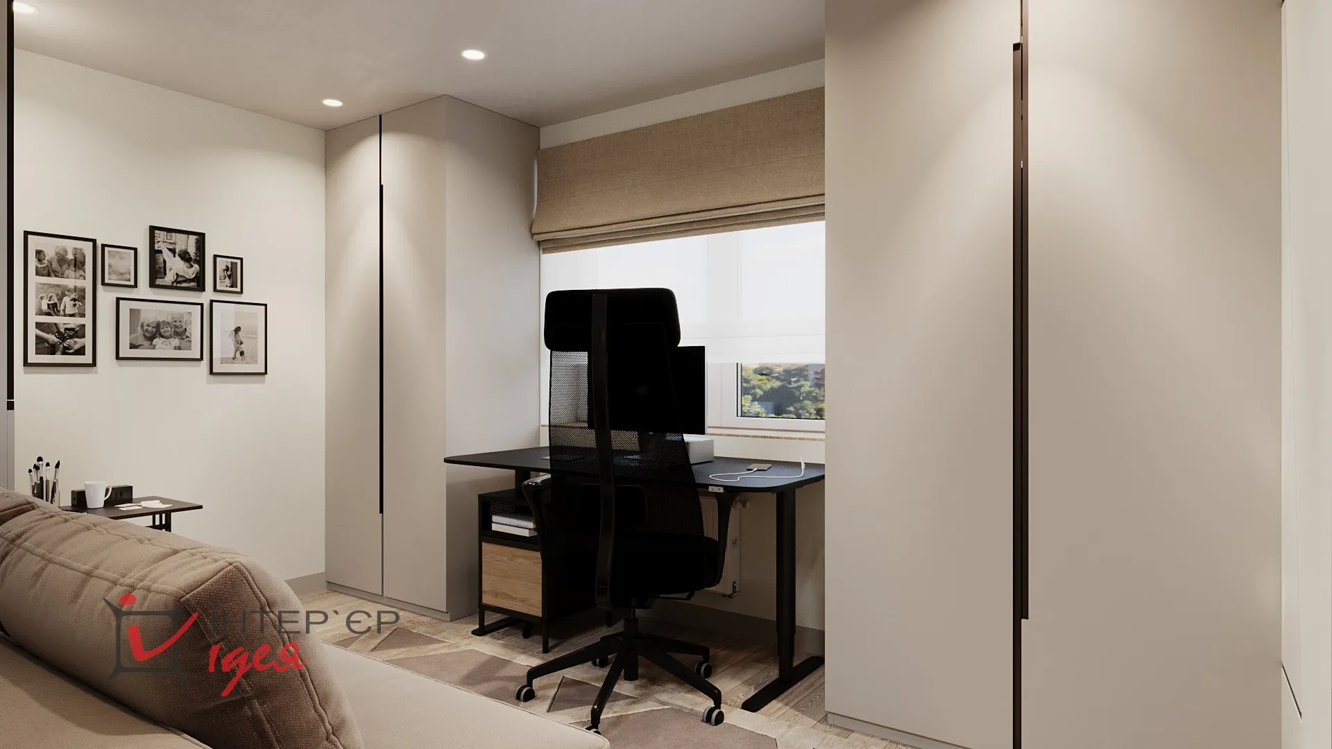 На етапі реалізації дитяча кімната була трансформована у робочий кабінет/гостьову кімнату. В інтер’єрі переважають стримані кольори, геометричні акценти та функціональні меблі. Для зберігання використано високі шафи з інтегрованими ручками, що створює відчуття цілісності. Робоча зона чоловіка максимально ергономічна - з якісним кріслом, великим робочим столом, природним освітленням і закритими системами зберігання. Особливу роль відіграє декор - фото родини на стіні додають тепла та індивідуальності. М'який розкладний диван дає змогу використовувати кімнату як гостьову за потреби.