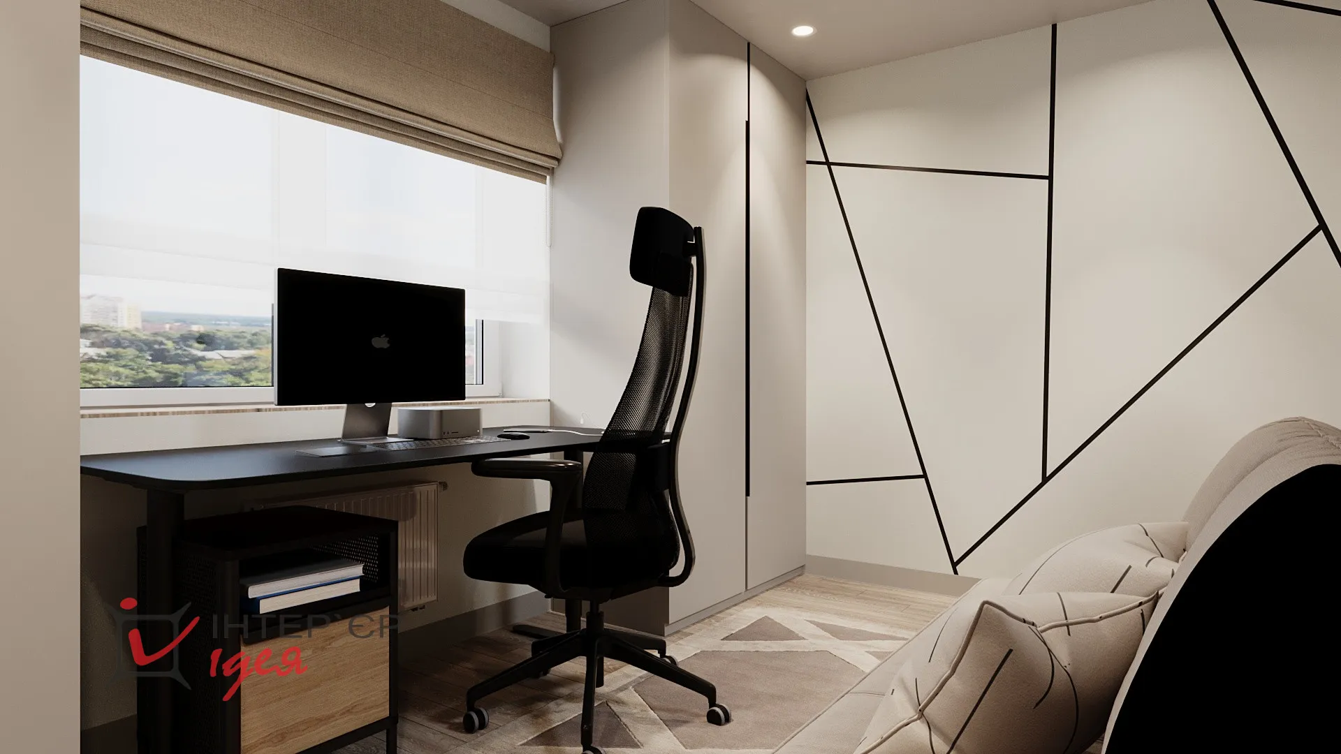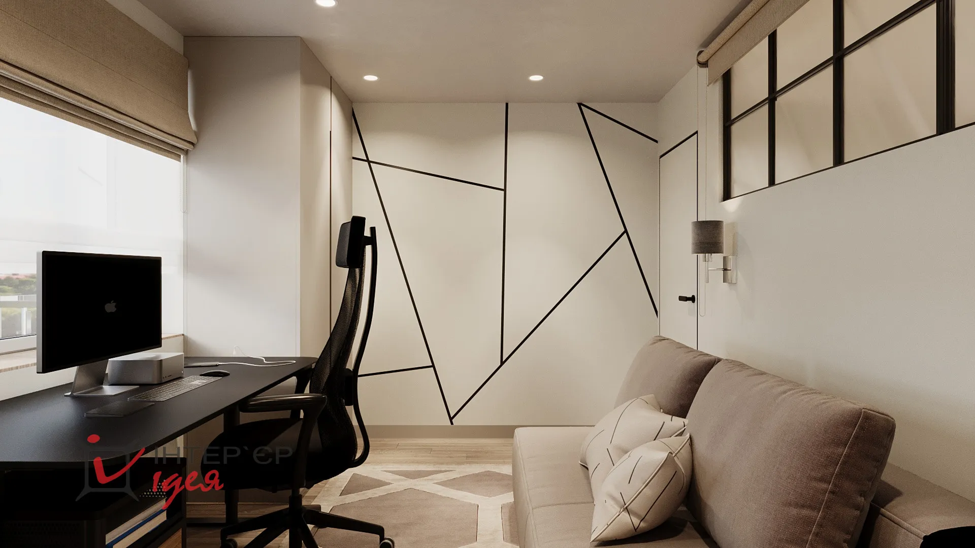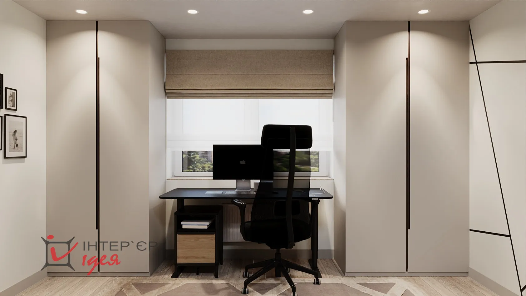На етапі реалізації дитяча кімната була трансформована у робочий кабінет/гостьову кімнату. В інтер’єрі переважають стримані кольори, геометричні акценти та функціональні меблі. Для зберігання використано високі шафи з інтегрованими ручками, що створює відчуття цілісності. Робоча зона чоловіка максимально ергономічна - з якісним кріслом, великим робочим столом, природним освітленням і закритими системами зберігання. Особливу роль відіграє декор - фото родини на стіні додають тепла та індивідуальності. М'який розкладний диван дає змогу використовувати кімнату як гостьову за потреби.
