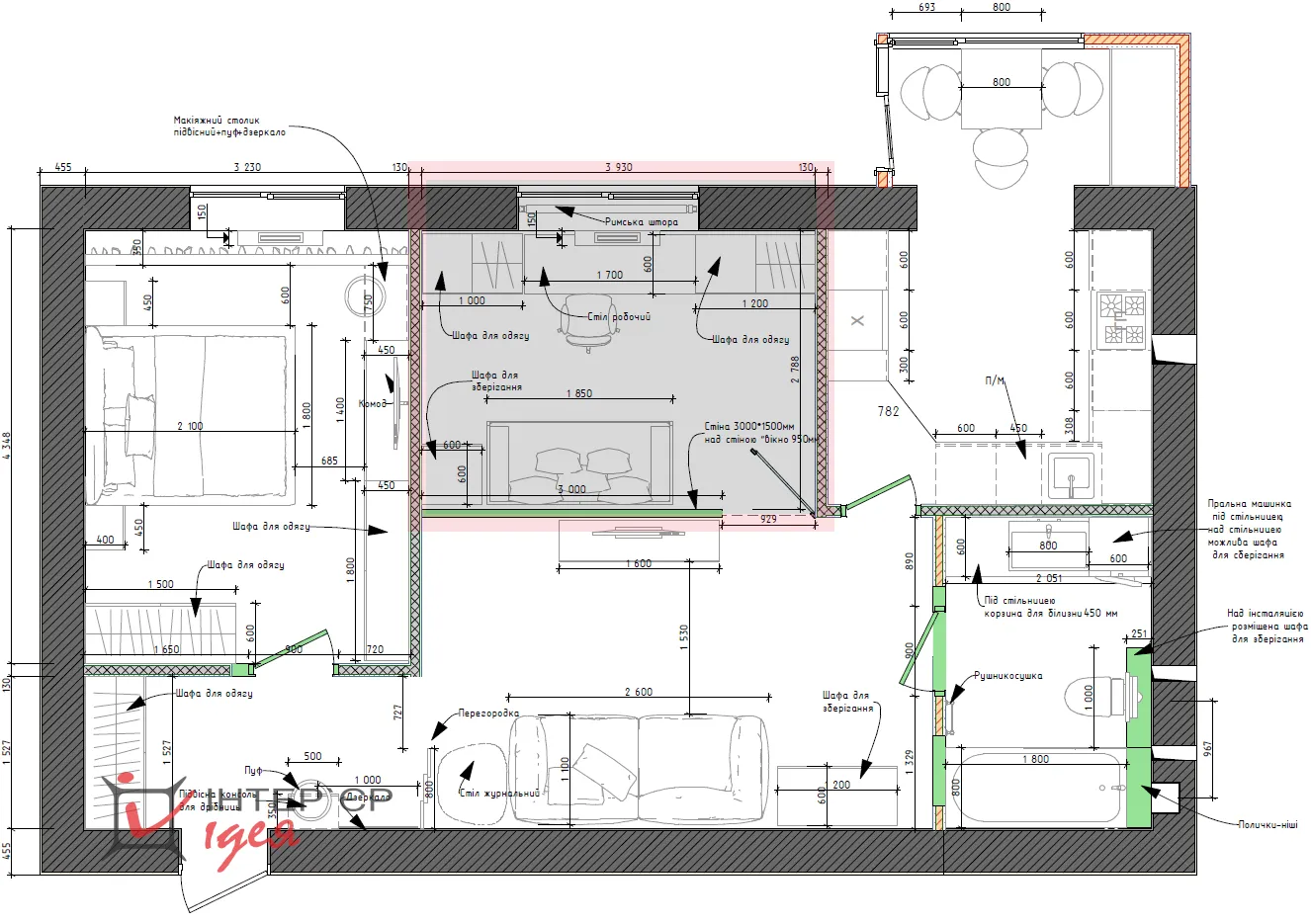 Особливу увагу приділено організації вітальні, яка не має прямого доступу до природного світла. Щоб уникнути темного замкнутого простору, ми запропонували рішення - перегородка з вікном у стилі інтер'єрного скління, що дозволяє світлу з кабінету проникати у вітальню. Це значно покращило атмосферу кімнати, зробивши її світлішою й візуально просторішою.