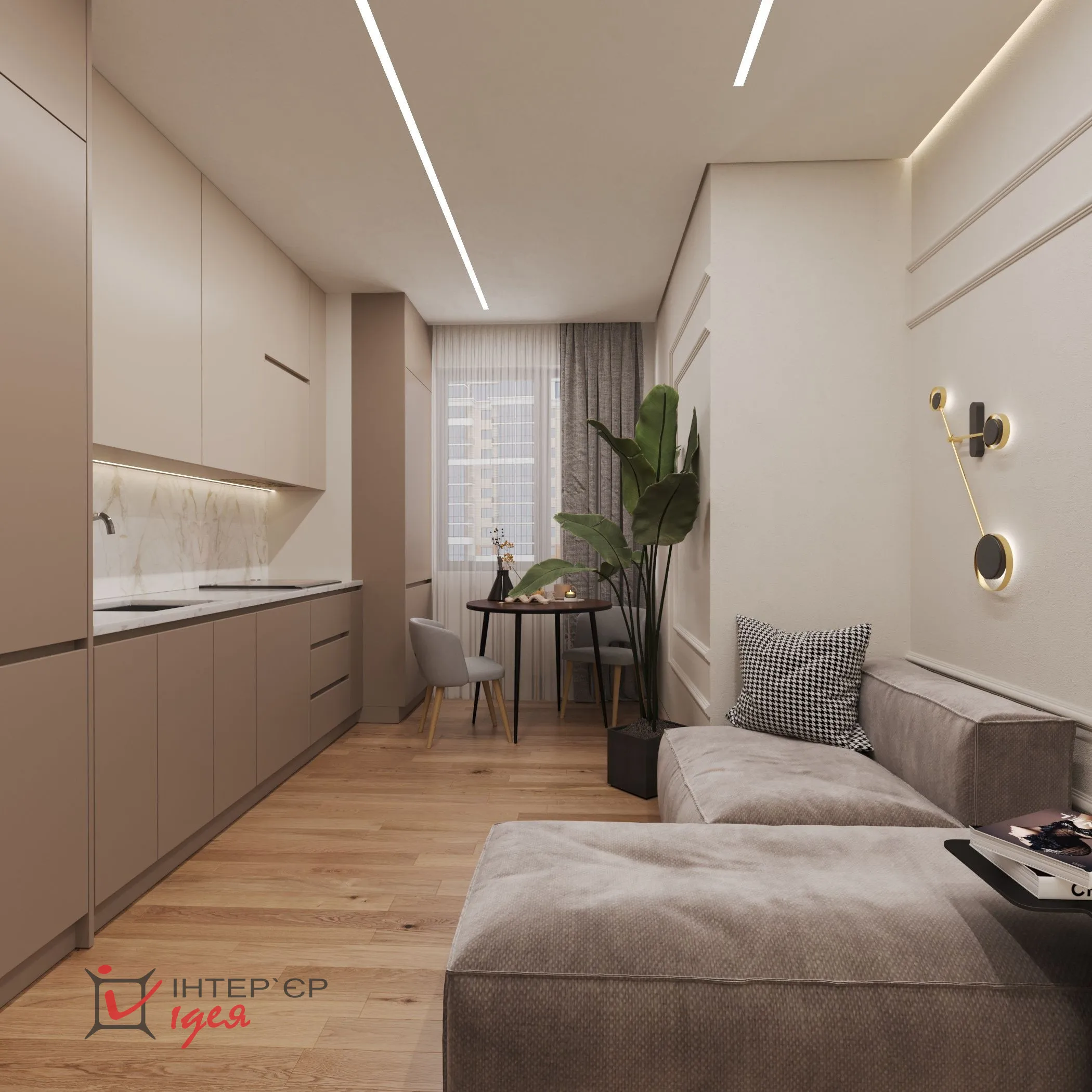 Це приміщення - виглядає дуже світло та затишно. Стіни пофарбовані у світло-бежевий колір, що додає простору світлоти та ніжності. Меблі в світло-сірому та бежевому кольорах.