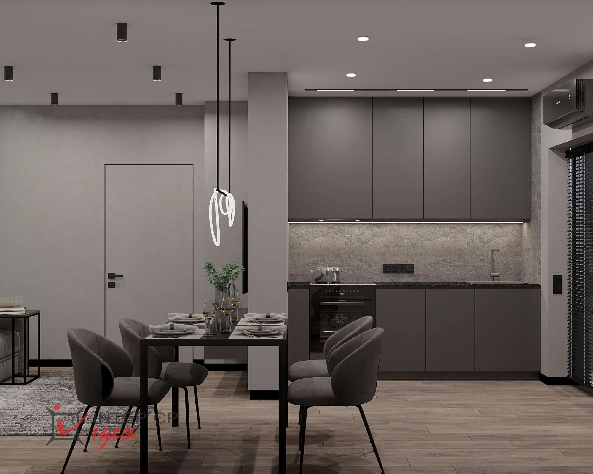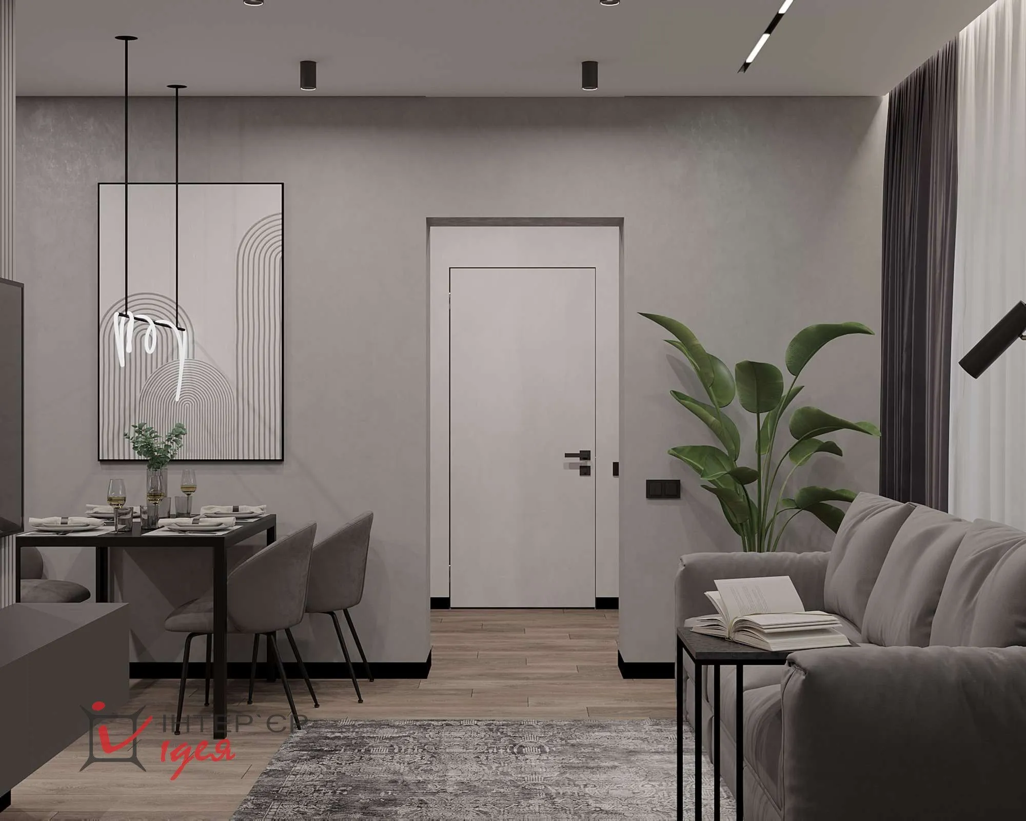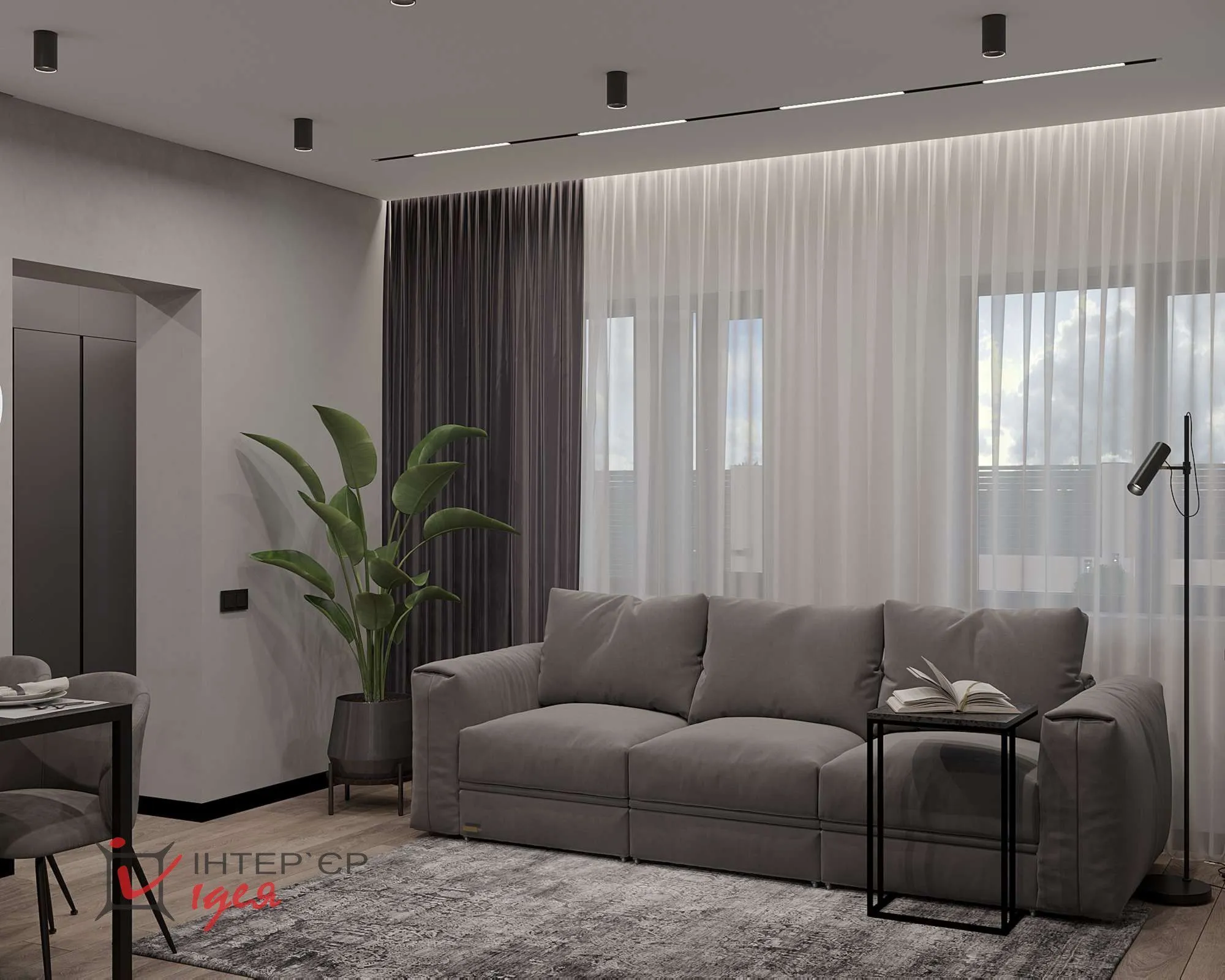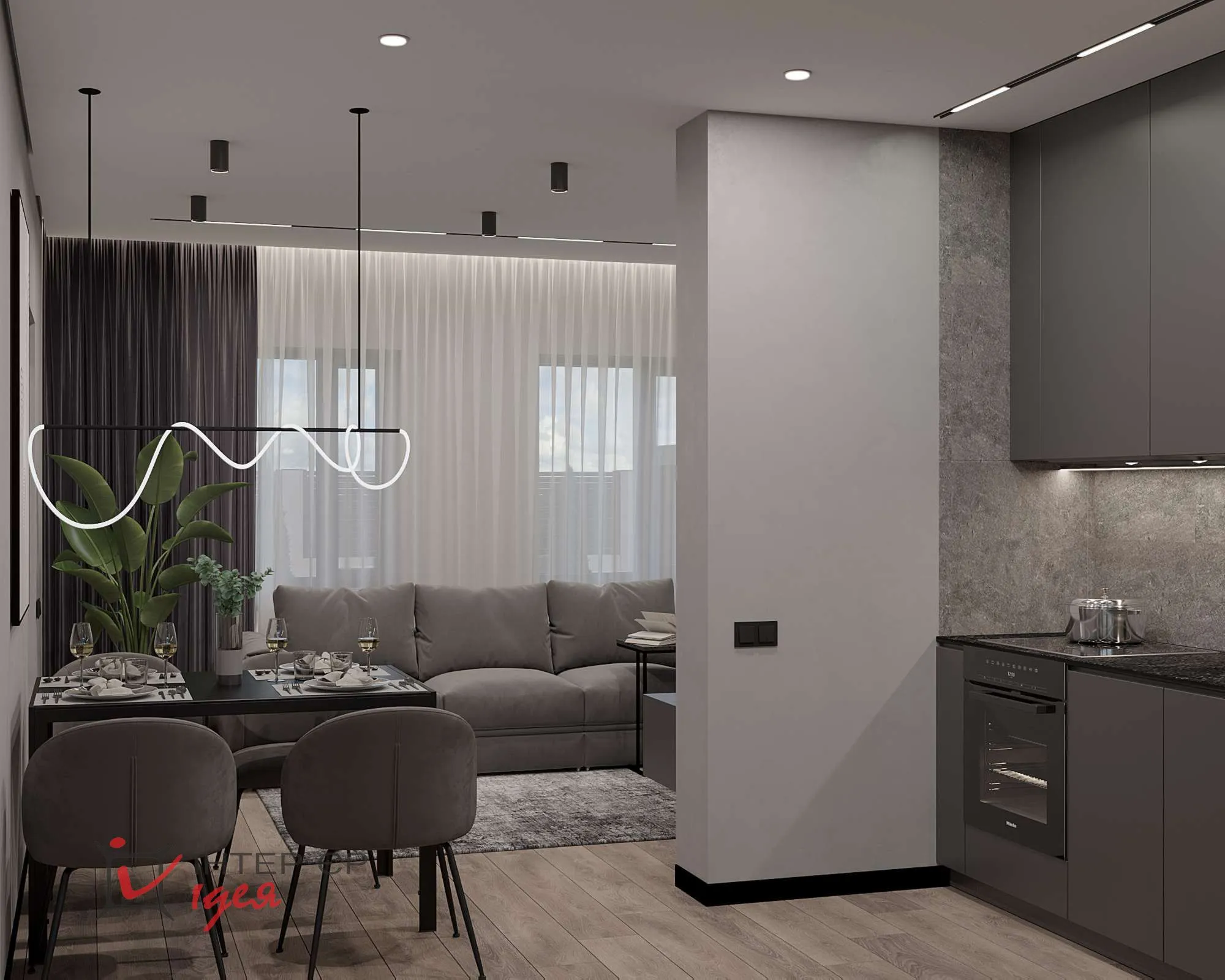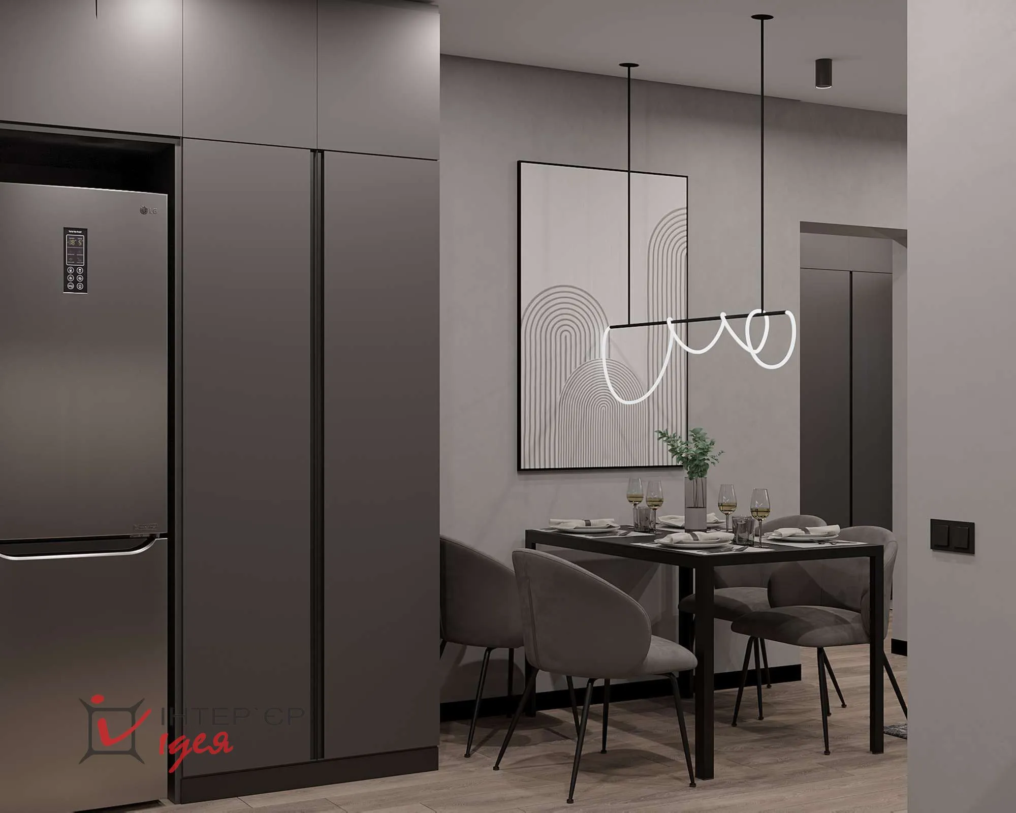 Кухня-вітальня виконана в сучасному стилі, який створює відкритий та затишний простір, де можна об'єднати функціональність кухні та зручність вітальні. Простір кухні розділений на дві частини: робоча поверхня та місце для зберігання з холодильником, що робить таке розташування меблів надзвичайно зручним. У зоні вітальні розташований зручний диван фірми "Frankof".