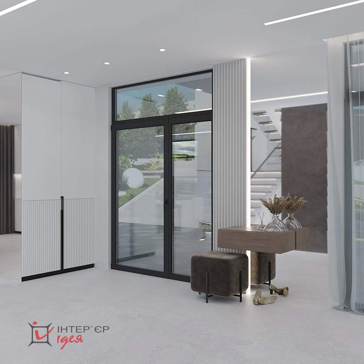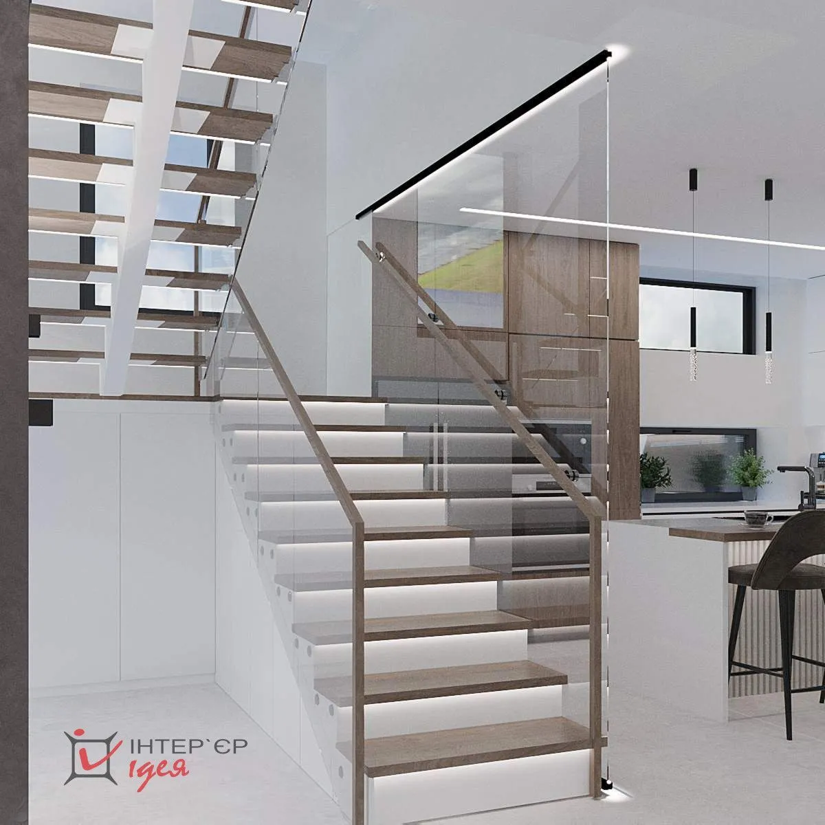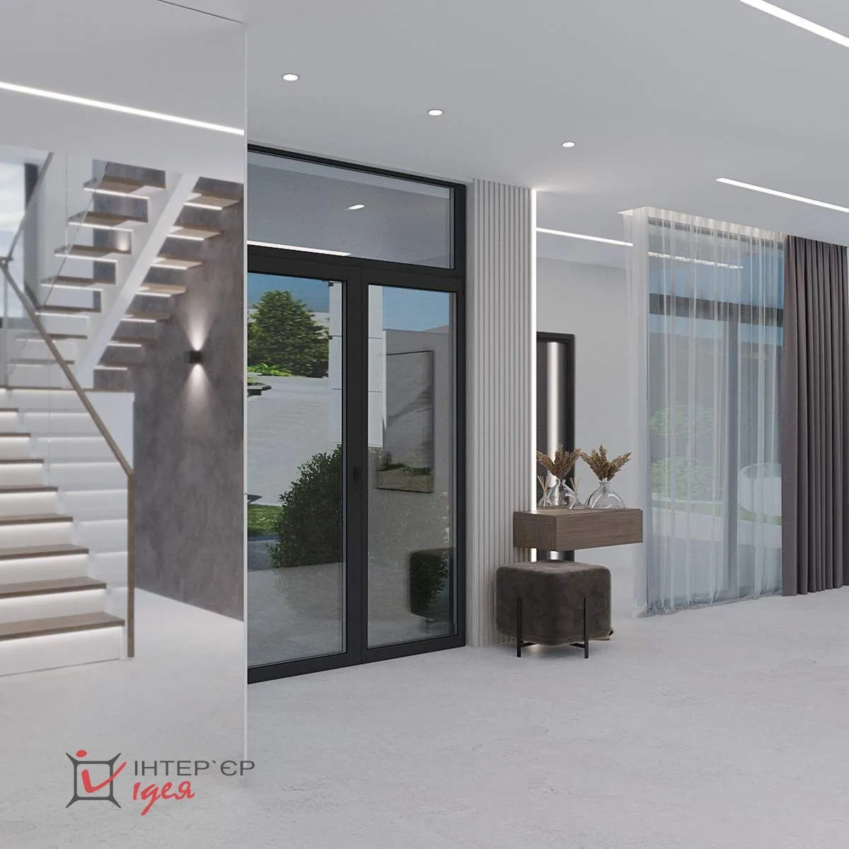 При вході в приватний будинок нас зустрічають сходи з підсвіткою, скляними поручнями та скляною перегородкою з підсвіткою, яка розділяє зону кухні-студії та передпокою. Біля вхідних дверей з одного боку розташована шафа, яка служить перегородкою, з іншого - зручний пуф та полиця для дрібниць. Біля сходів розташований підйомник. Це було головне побажання замовниці. Під сходами розмістили шафи для зберігання. В зоні кухні-студії знаходиться велика, зручна, функціональна робоча зона та острів. Також є великий обідній стіл для приємного часу проведення з родиною та друзями.