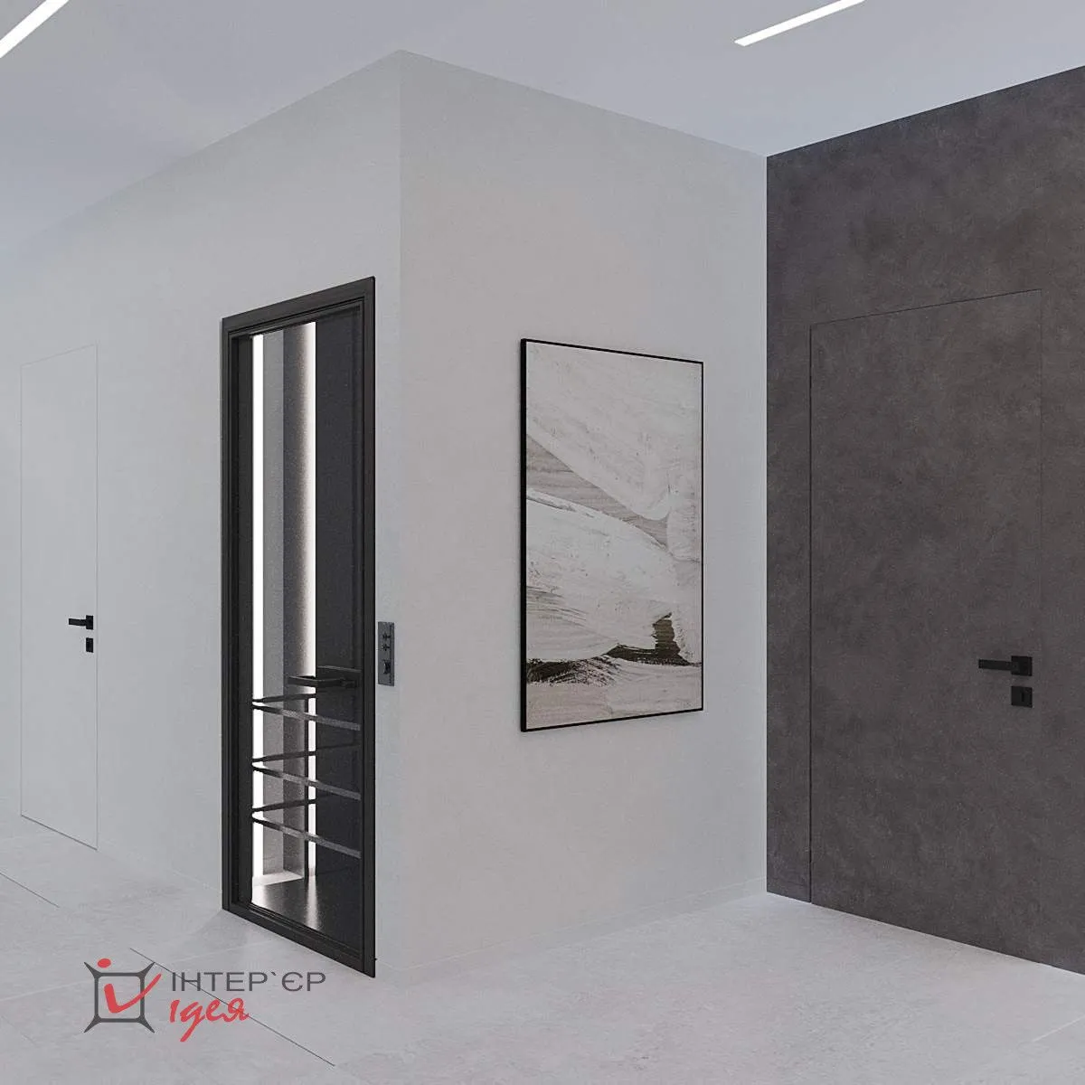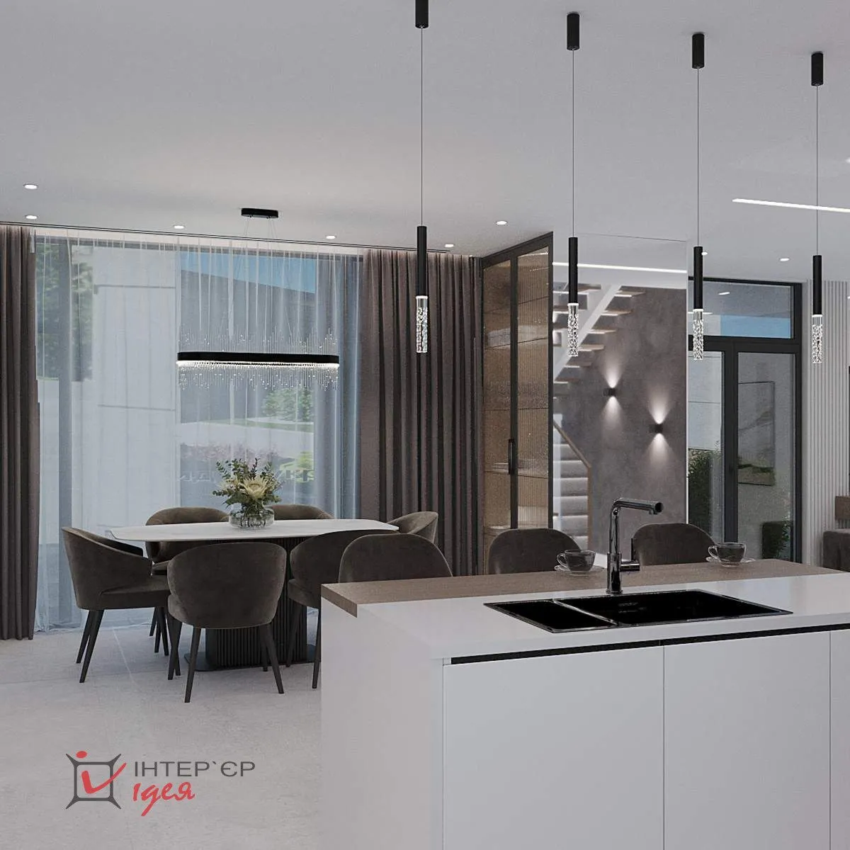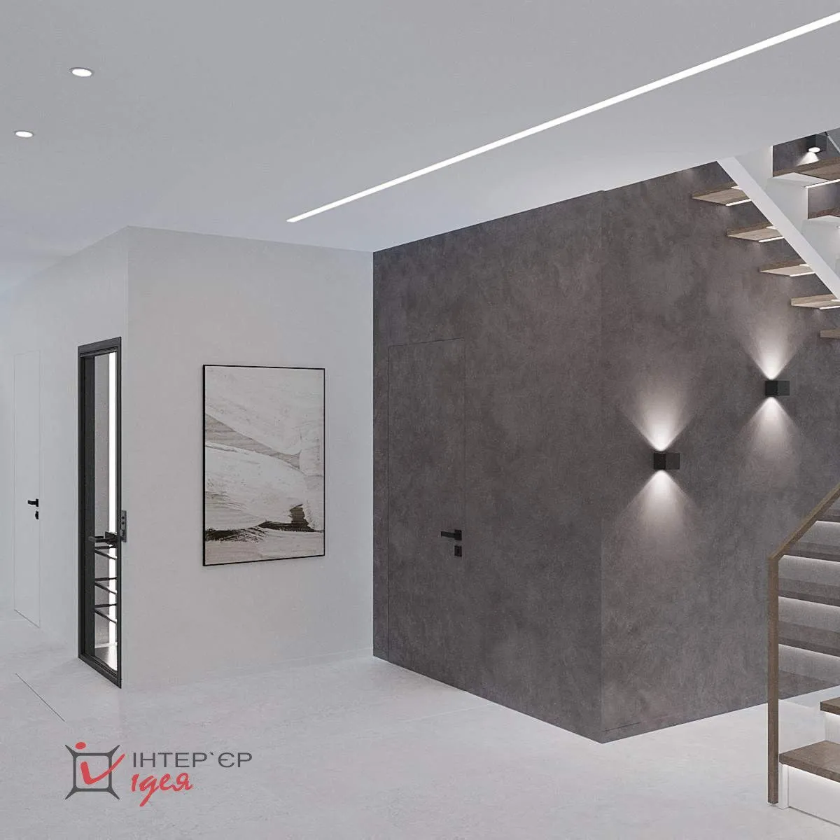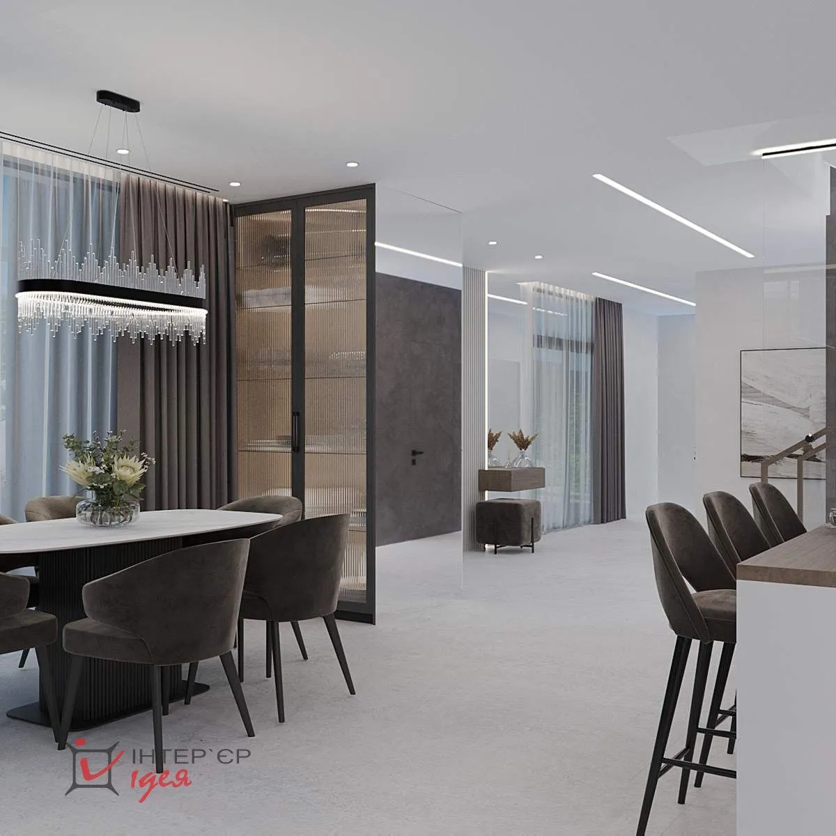 При вході в приватний будинок нас зустрічають сходи з підсвіткою, скляними поручнями та скляною перегородкою з підсвіткою, яка розділяє зону кухні-студії та передпокою. Біля вхідних дверей з одного боку розташована шафа, яка служить перегородкою, з іншого - зручний пуф та полиця для дрібниць. Біля сходів розташований підйомник. Це було головне побажання замовниці. Під сходами розмістили шафи для зберігання. В зоні кухні-студії знаходиться велика, зручна, функціональна робоча зона та острів. Також є великий обідній стіл для приємного часу проведення з родиною та друзями.