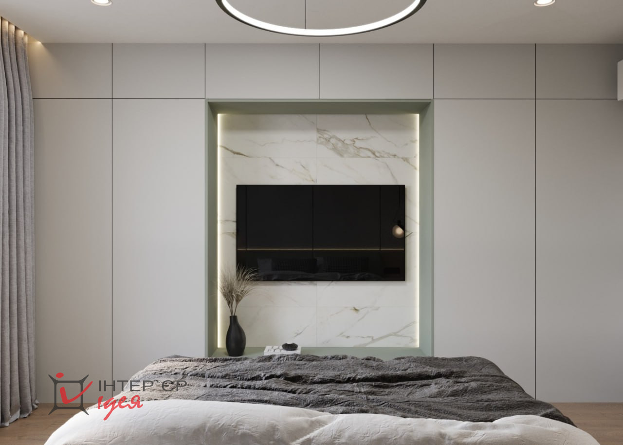 Інтер’єр виконаний в світлій палітрі з акцентом на фактури - натуральне дерево в меблях, мікроцемент на стіні за узголів'ям та мармур в ніші з телевізором.