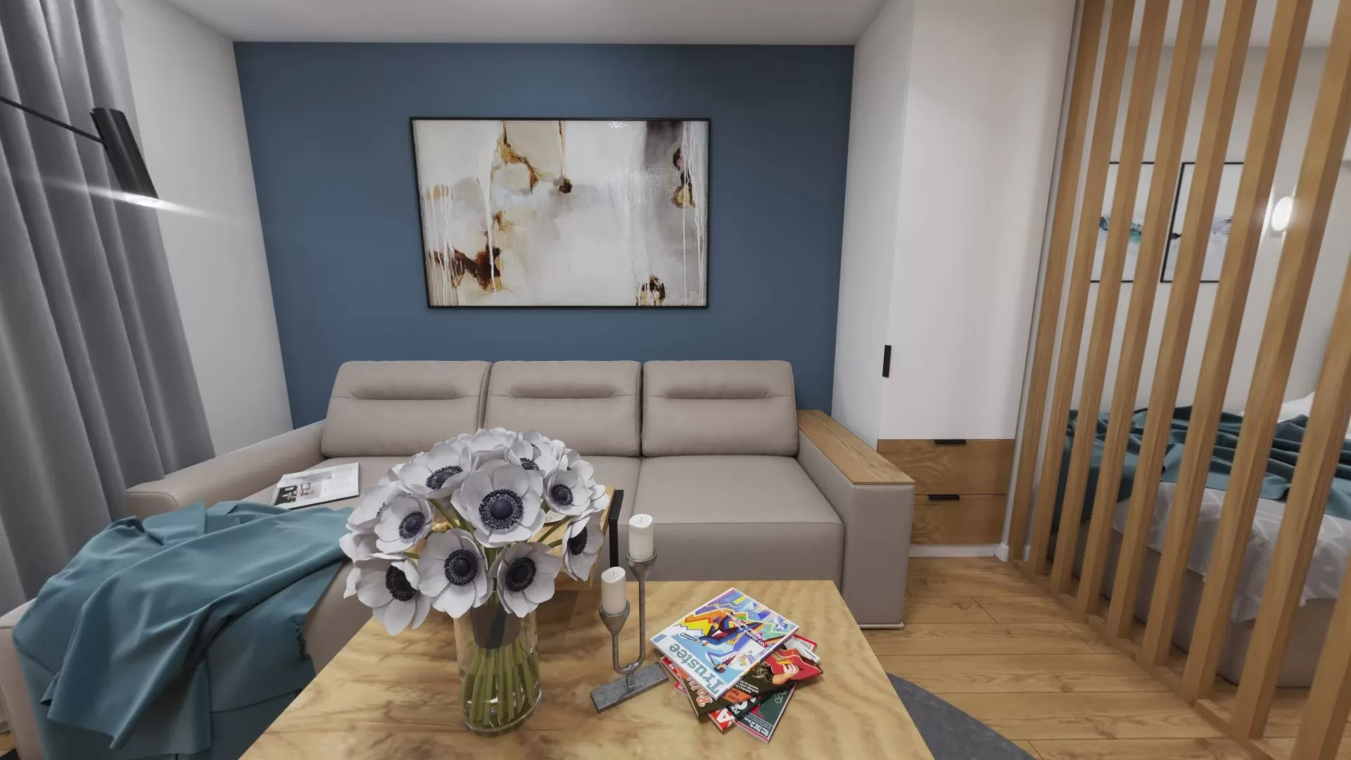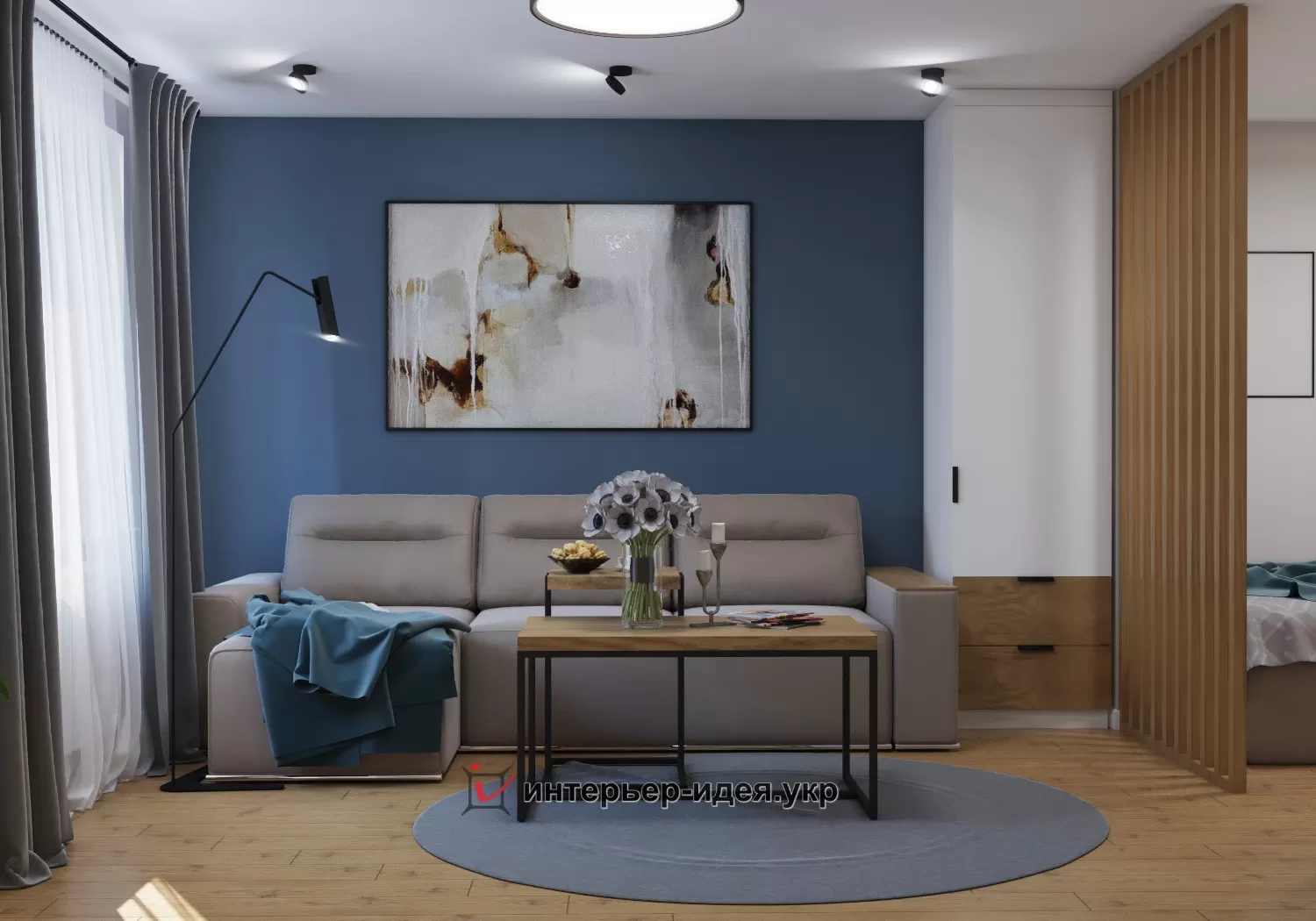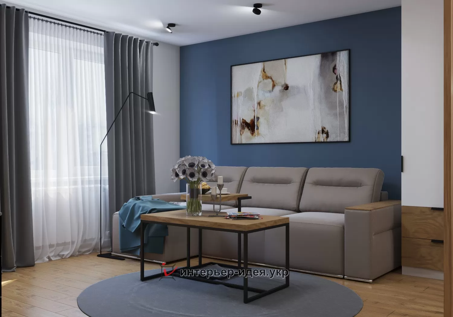 На стіні за диваном доповнюючим елементом використали велику картину.