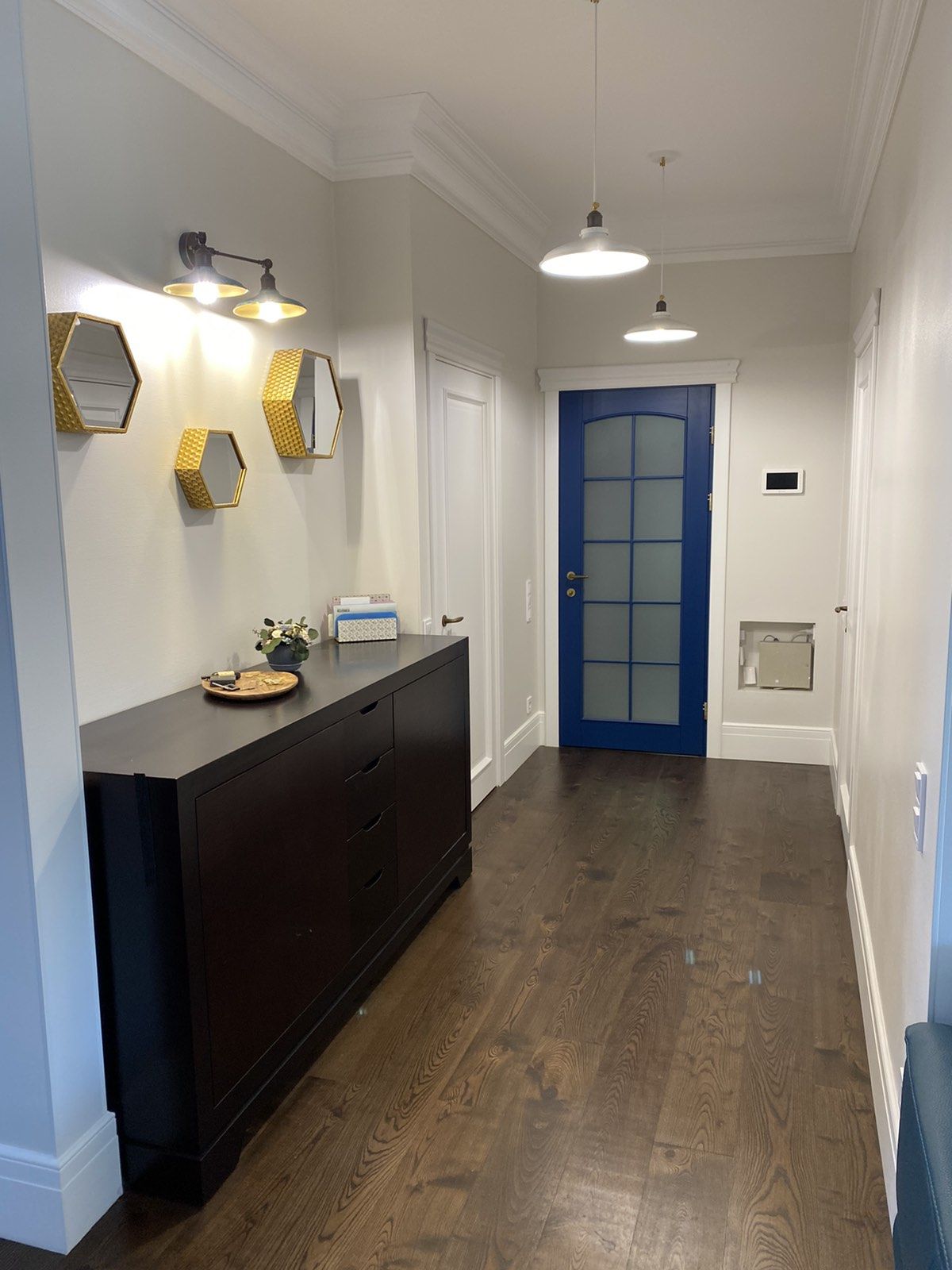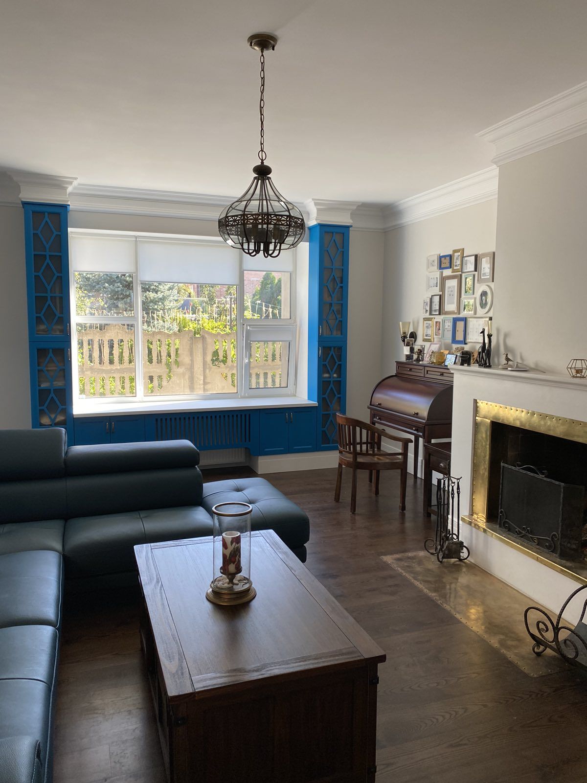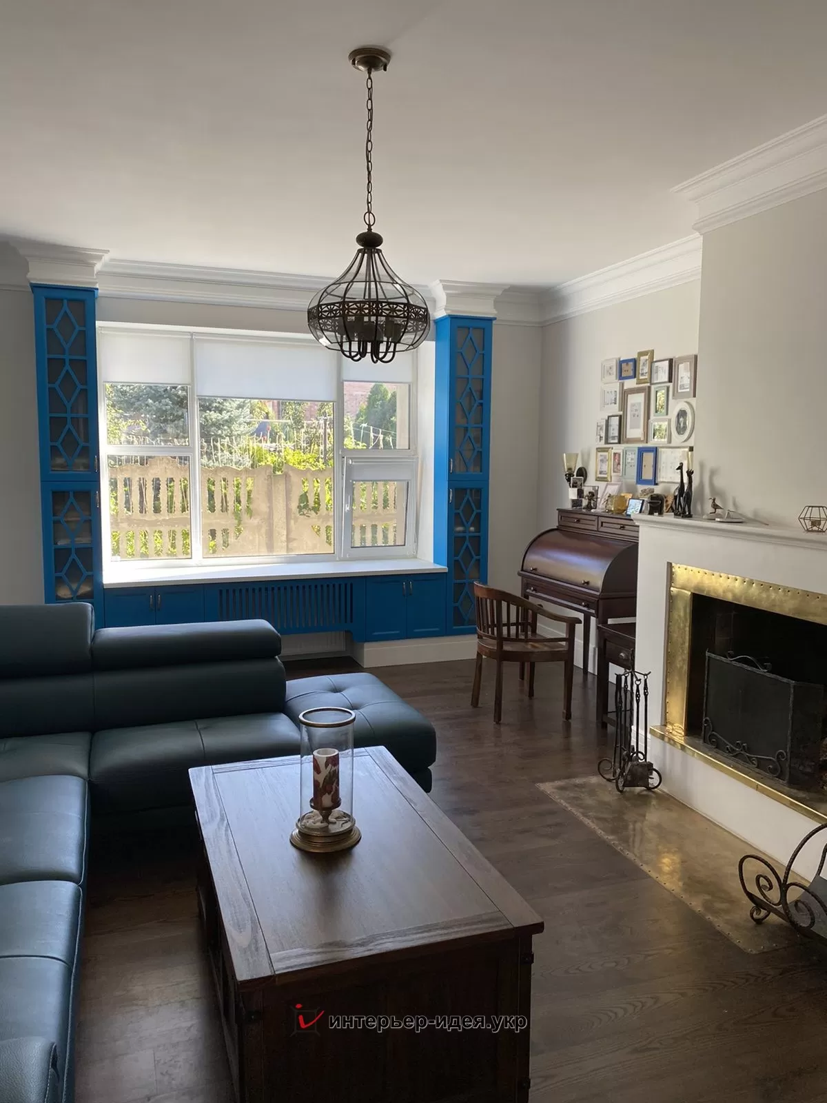 Центральне місце у вітальні займає камін, оформлений досить лаконічно, «лофтово». Він функціонально і емоційно об'єднує усі елементи вітальні.